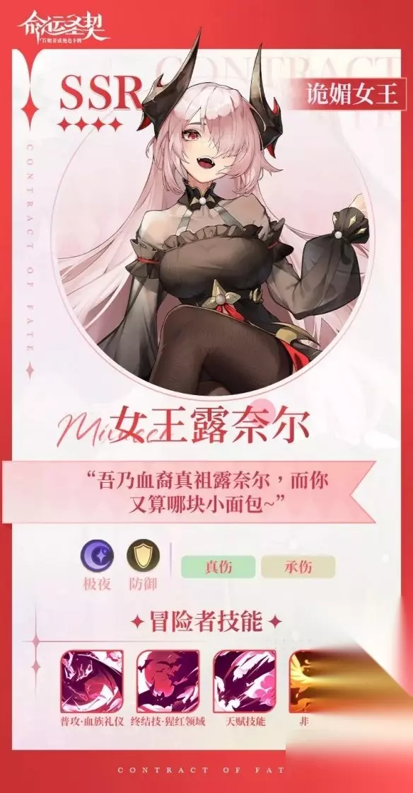四、露奈尔 技能介绍 1、常规技能:普攻·血族礼仪、终结技·猩红领域、天赋技能、非凡觉醒 2、终结技(猩红领域): 对敌方前排目标造成魔法伤害,并附加高额真实伤害,释放技能后提升自身防御力。