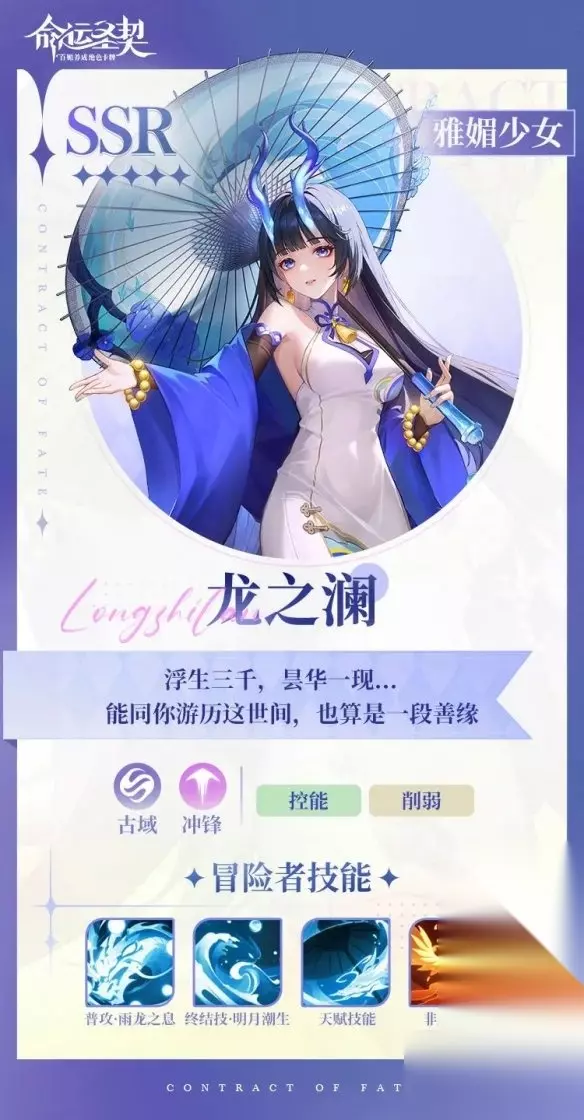 五、龙之澜 技能介绍 1、常规技能:普攻·雨龙之息、终结技·明月潮生、天赋技能、非凡觉醒 2、终结技(明月潮生): 对敌方全体目标造成魔法伤害,并使我方全体获得【祈福】。 【祈福】:提升伤害并降低受到伤害,在回合结束时回复能量值。