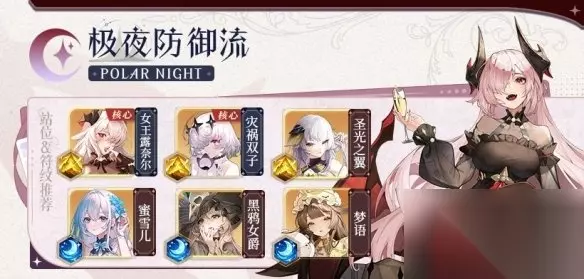 阵容推荐 极夜防御流 1、阵容组成:女王露奈尔、灾祸双子、蜜雪儿、黑鸦女爵、圣光之翼、梦语 2、玩法思路:这套阵容蜜雪儿、黑鸦女爵、圣光之翼以及梦语等多重辅助角色,其技能相互叠加,形成多样化的控制策略,有效限制了敌人的动作,大幅削弱了对方的战斗输出。