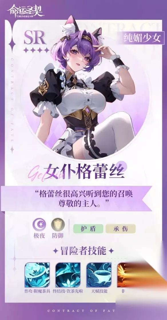 三、女仆格蕾丝 技能介绍 1、常规技能:普攻·附魔茶具、终结技·饮茶先啦、天赋技能、非凡觉醒 2、终结技(饮茶先啦): 对敌方前排目标造成物理伤害,并为自身提供护盾和额外减伤能力。 【女仆特性】:进入战斗时,额外获取护盾保护自身。