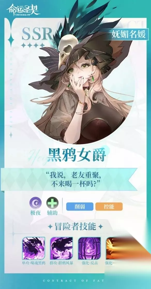 【攻略大全】 命运圣契角色图鉴大全 一、黑鸦女爵 技能介绍 1、常规技能:单攻-噬魂黑鸦、群攻-群鸦风暴、强化-反击、强化-非凡觉醒 2、群攻(群鸦风暴): 对敌方全体目标造成魔法伤害,并降低敌方攻击力、最终增伤,持续到战斗结束。