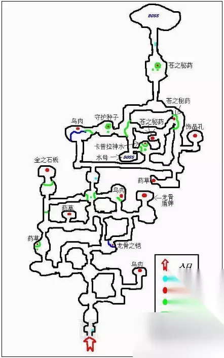 收集步骤: 1、在北面的山洞再往东走,会遇到一个房间内布满各色各样的黏怪,击败它们后再往北走有一个秘密房间,里面的宝箱就放有龙骨盾牌(1/1盾牌)。往绿水洞中南部的通道走去,经过一个水池后往西周,就可以来到露台上,搜刮那儿的宝箱,获得龙骨之铠甲(1/1装甲)。