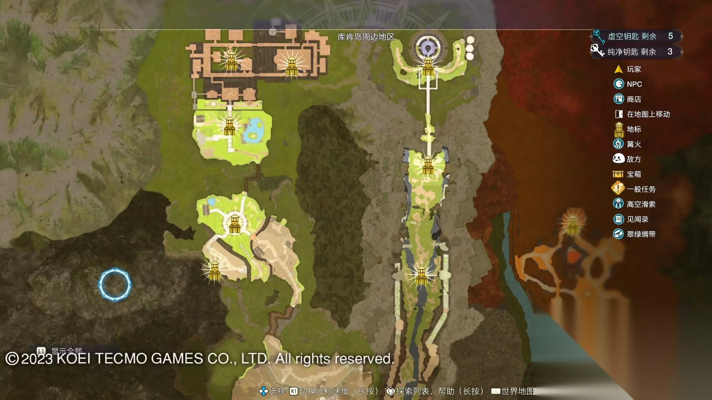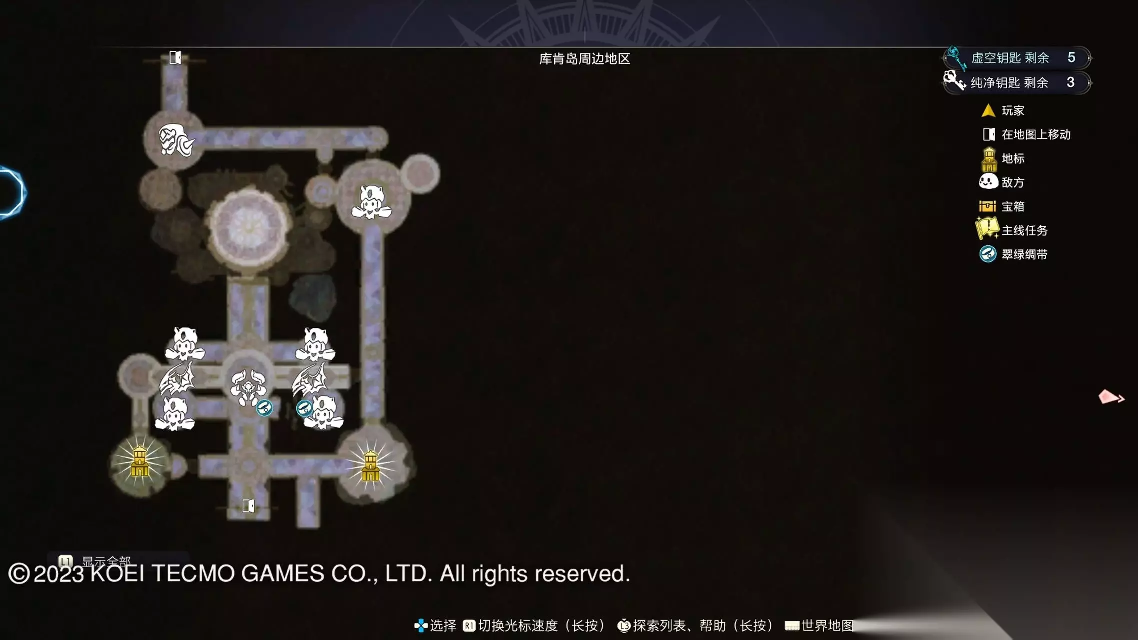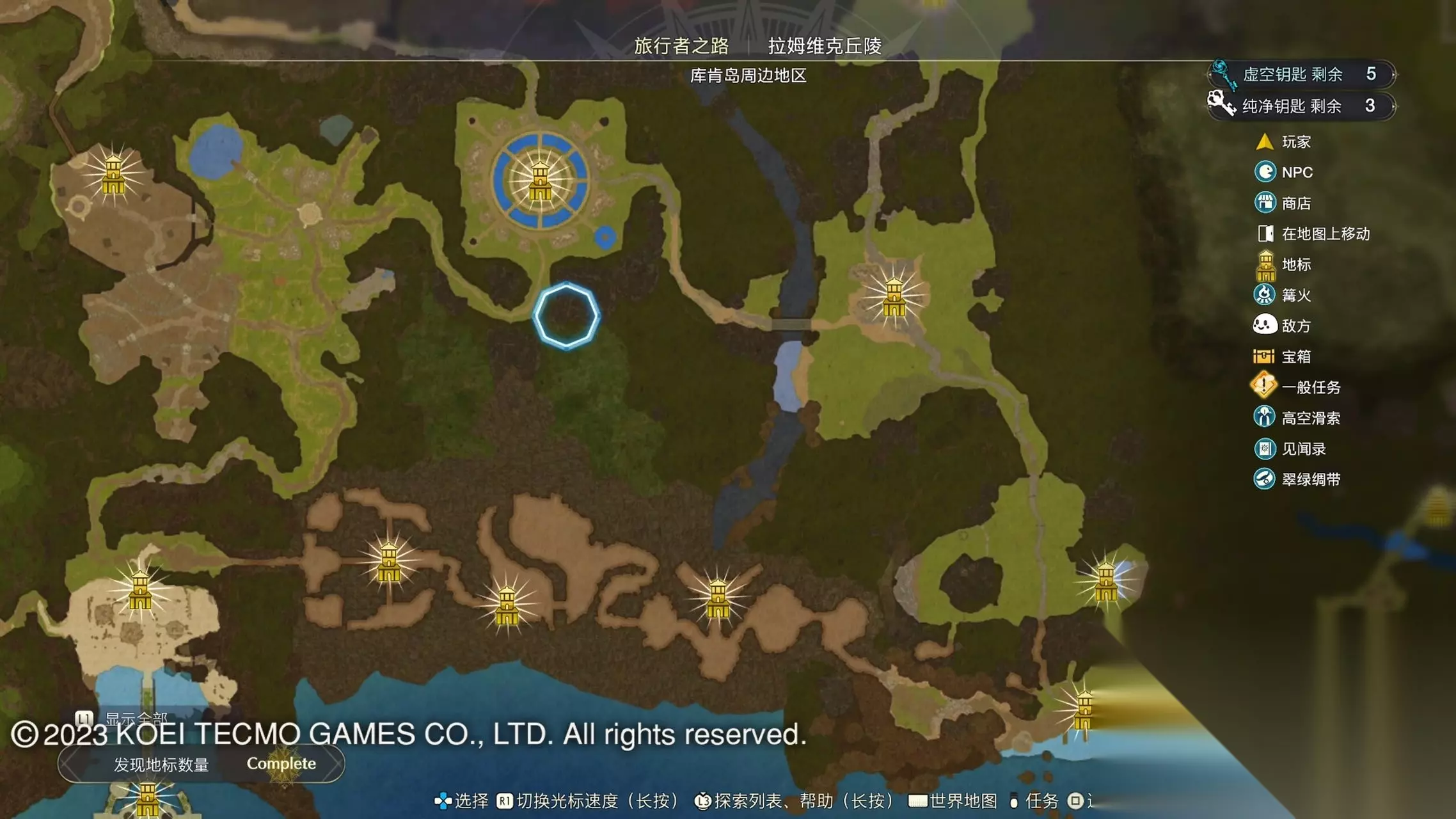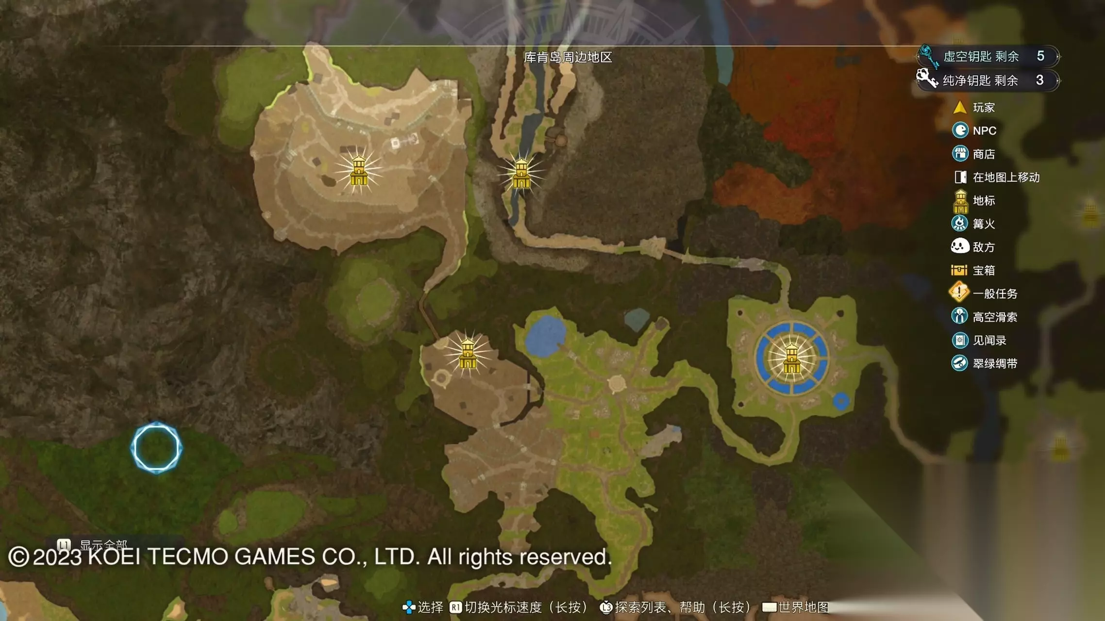 《莱莎的炼金工房3》全地图地标位置图 一部分地区需要翠绿绸带、地兽的龙吼、水兽、空气糖才能进入,所以建议初次到达新地图的时候不要着急到达所有地标。最后准备收尾的时候先做出带有召唤灵兽・超、地兽吐息强化・大的召唤师之铃和带有连结水晶・全的翠绿绸带以后再去探索地图。召唤灵兽・超可以让灵兽的移动速度达到最快。 还有一些地方的门或者结界需要用对应属性的钥匙开,有时候第一次到达的时候没有提示,不用着急以后再来就可以开了。如果缺少对应属性的钥匙就快速移动到各个地标用虚空钥匙做新钥匙即可。 这里我把已经全开的地图放上,有一些比较绕的路大家可以照着图来跑。 库肯岛周边地区 库肯岛的地标全部是自动发现的 小妖精森林
