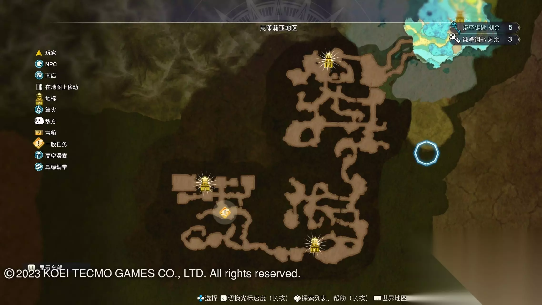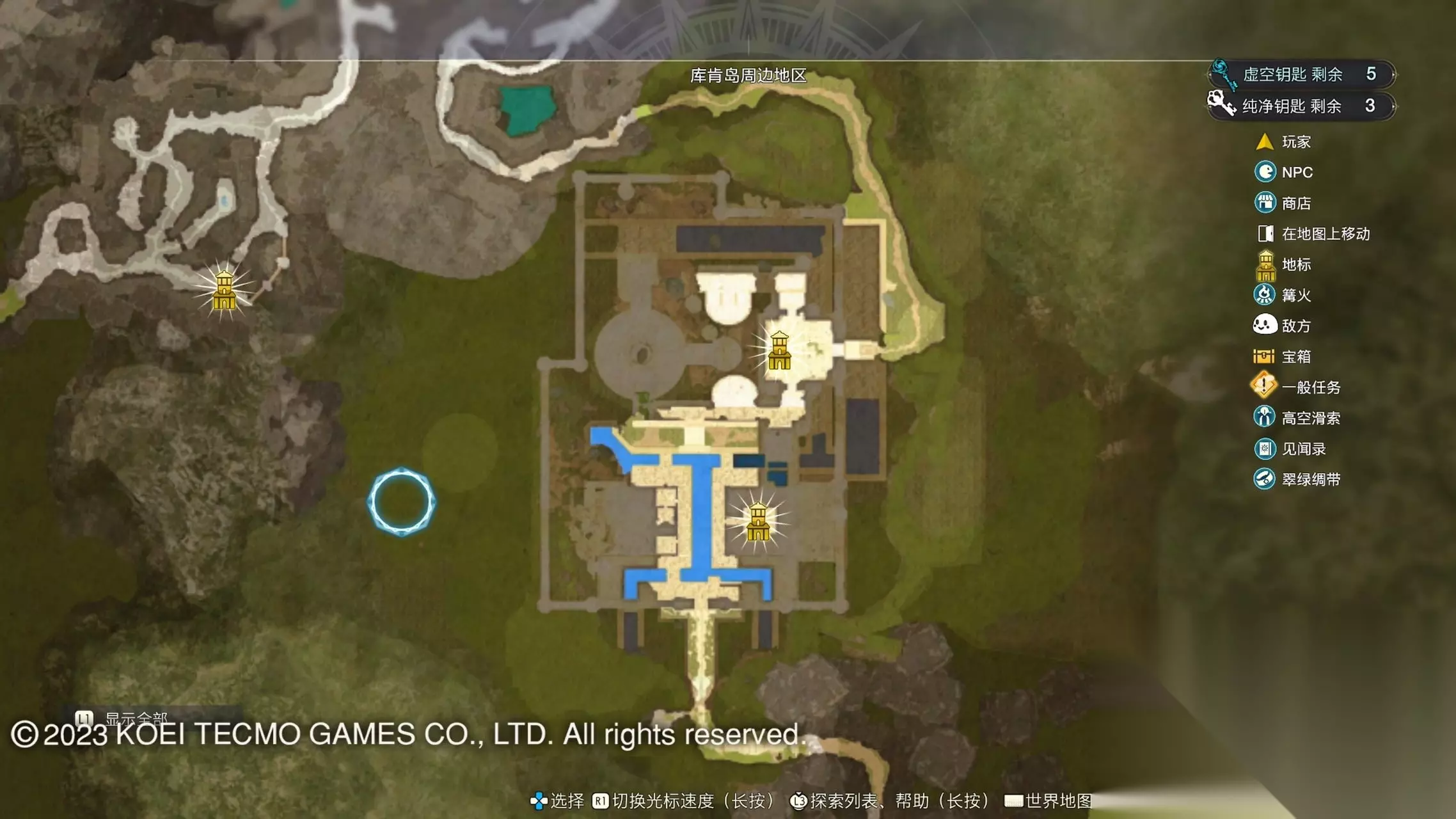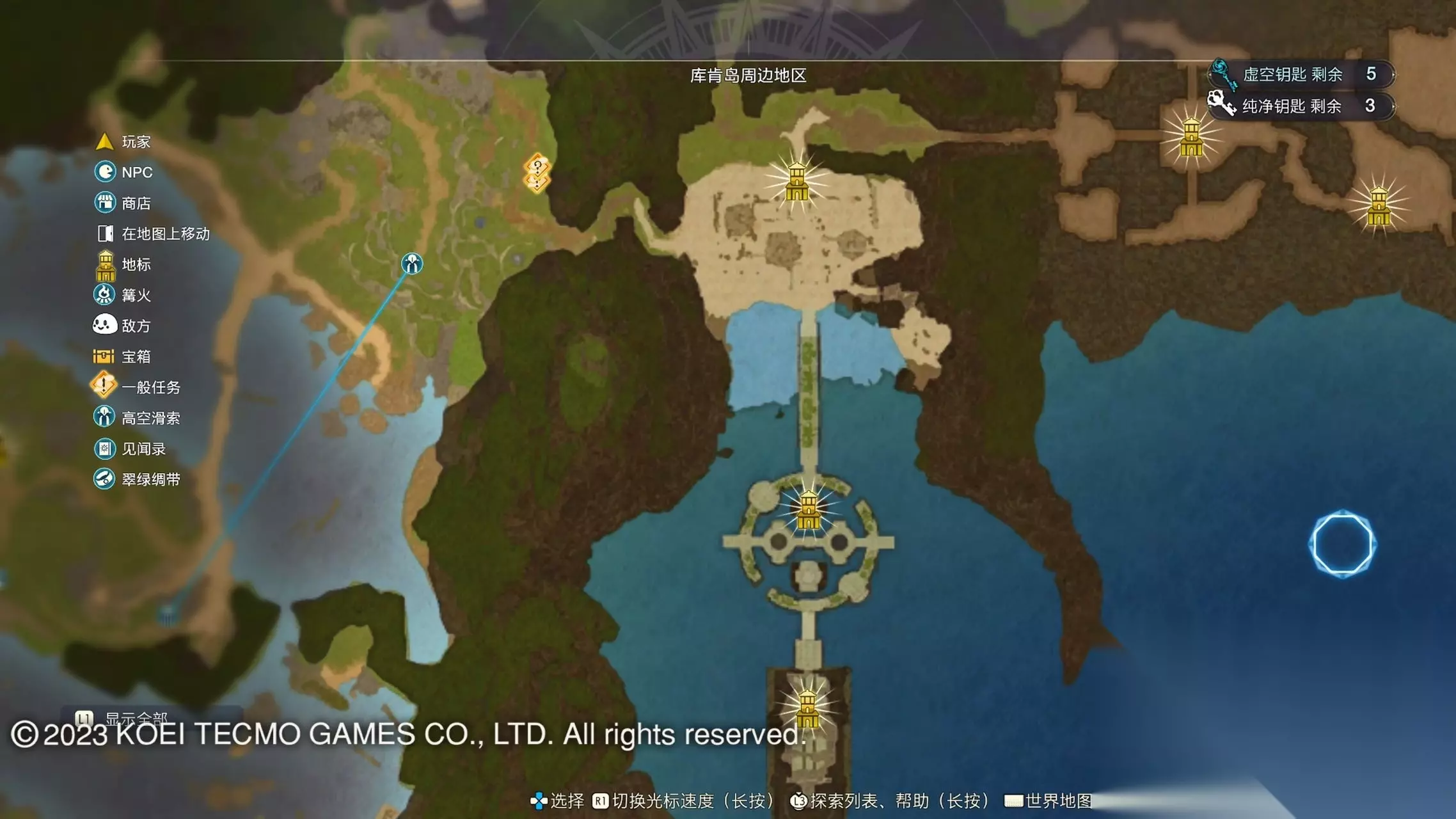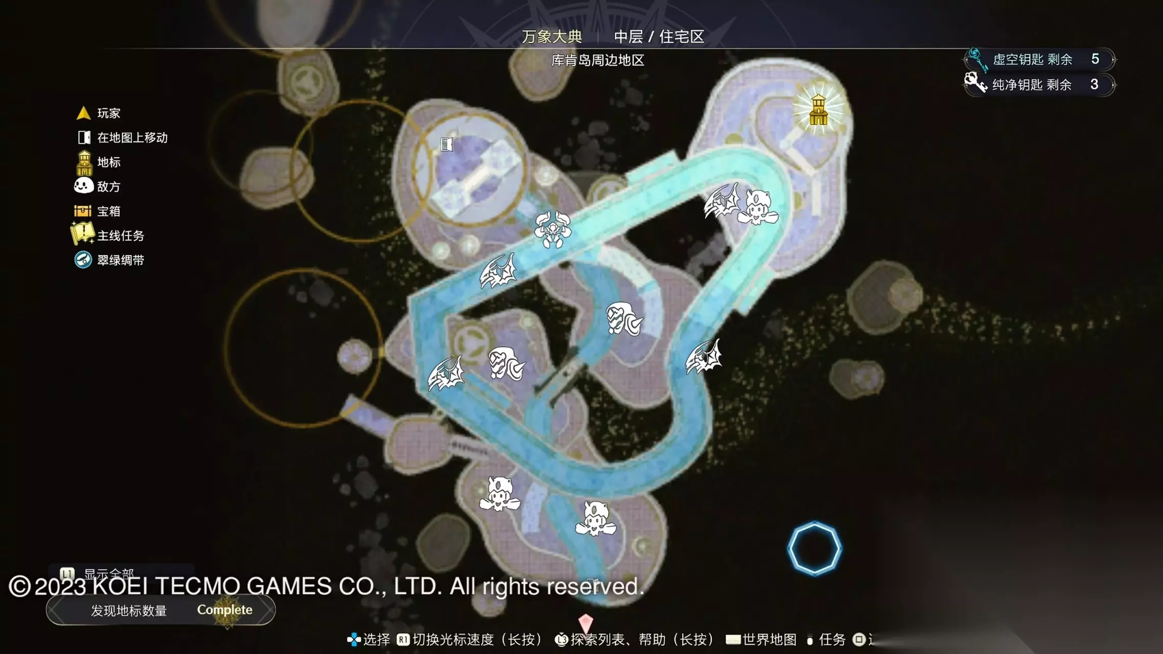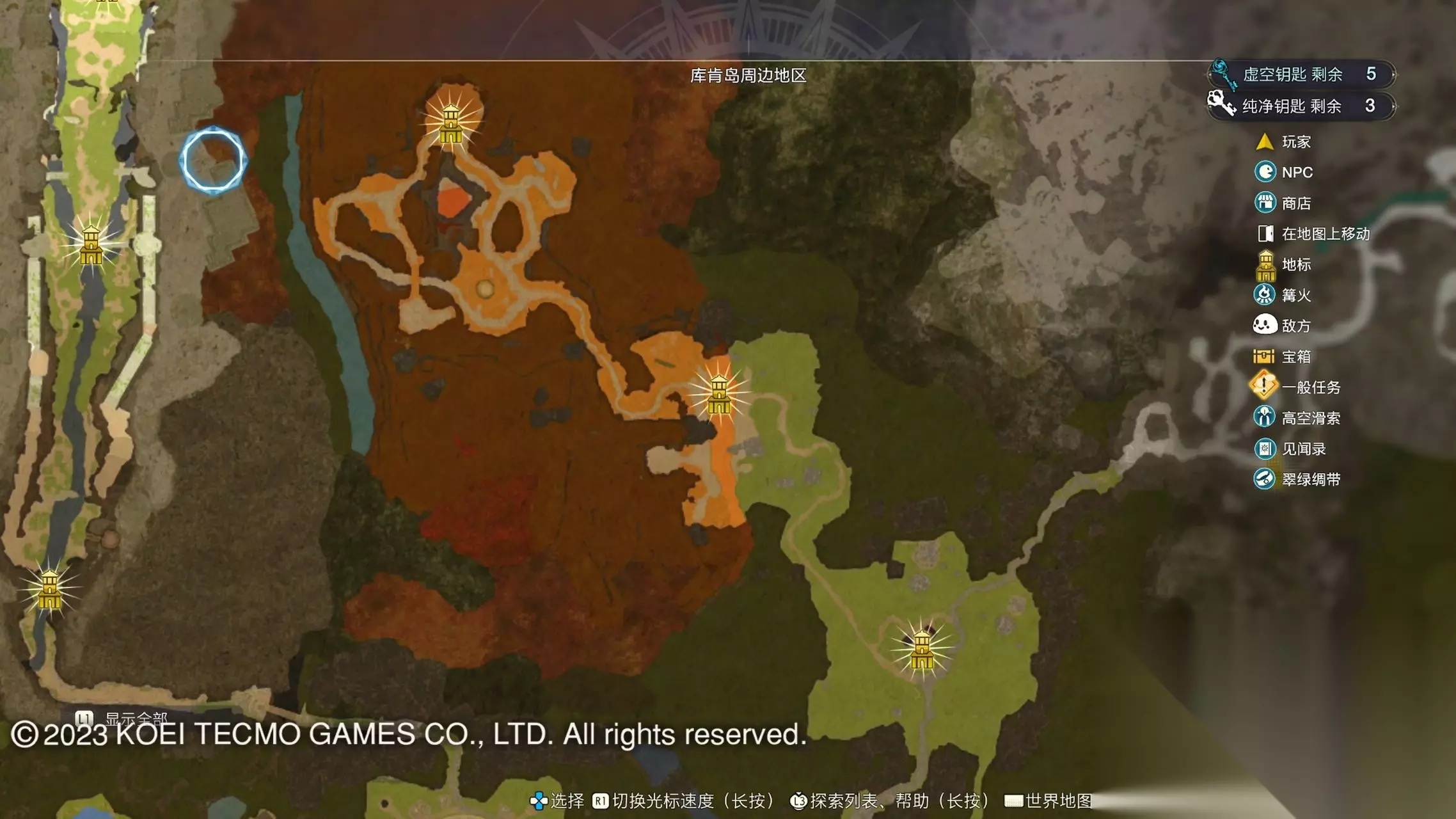 《莱莎的炼金工房3》全地图地标位置图 一部分地区需要翠绿绸带、地兽的龙吼、水兽、空气糖才能进入,所以建议初次到达新地图的时候不要着急到达所有地标。最后准备收尾的时候先做出带有召唤灵兽・超、地兽吐息强化・大的召唤师之铃和带有连结水晶・全的翠绿绸带以后再去探索地图。召唤灵兽・超可以让灵兽的移动速度达到最快。 还有一些地方的门或者结界需要用对应属性的钥匙开,有时候第一次到达的时候没有提示,不用着急以后再来就可以开了。如果缺少对应属性的钥匙就快速移动到各个地标用虚空钥匙做新钥匙即可。 这里我把已经全开的地图放上,有一些比较绕的路大家可以照着图来跑。 库肯岛周边地区 库肯岛的地标全部是自动发现的 小妖精森林