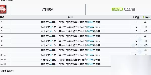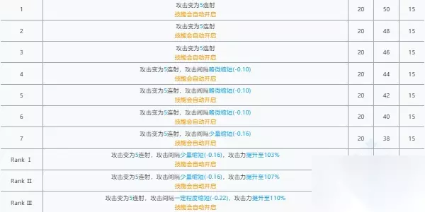 3.技术 1技术‘冲击形式’:能天使的下次进犯变为3连射,每次射击形成适当于进犯力105%~145%的损伤(技力耗费4~5点)。1技术在前期资源缺乏的情况下能够作为前期补足损伤的一个手法,一技术合作能天使的榜首天分‘快速弹夹’能够普通的打出3连击,输出滑润,运用起来也不卡手,比较合适前期处理护甲比较低的敌怪。专精主张有才能的专3或许不专,布衣玩家7级技术即可。