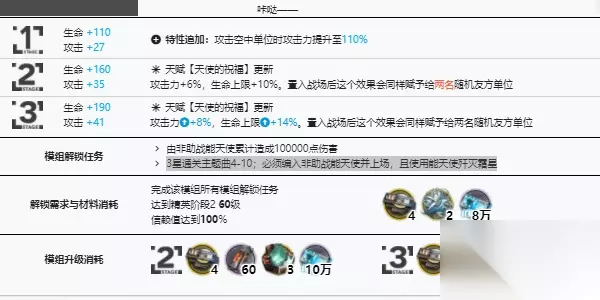 5模组‘天使的创作’ 模组1级:生命加100点,进犯加27点(追加特性:进犯空中单位时进犯力提高至110%),模组2级:生命加160点,进犯加35点(天分【天使的祝愿】更新进犯力加6%,生命上限加10%。置入战场后这个作用会相同赋予给两名随机友方单位),模组3级生命加190进犯加41(天分【天使的祝愿】更新进犯力加8%,生命上限加14%。置入战场后这个作用会相同赋予给两名随机友方单位)。模组解锁使命:由非助战能天使累计形成100000点损伤,3星通关主题曲4-10;有必要编入非助战能天使并上场,且运用能天使消灭霜星。