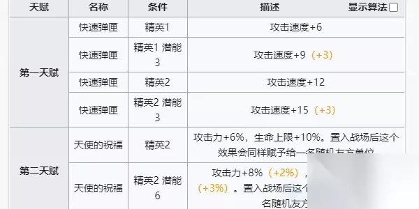 2.天分 能天使的榜首天分‘快速弹夹’:添加能天使的进犯速度6-12点;第二天分‘天使的祝愿’:进犯力添加6%-8%,生命上限添加10%-13%,而且置入战场后这个作用会相同赋予给一名随机友方单位(能天使布置时,若场上没有其他可选的友方干员,则第二天分将应用于本身和之后被布置的友方干员,直至到达最大额定收效数量)。这两个天分能够说是很好的符合了能天使的特性,进犯力与攻速的提高能够进一步的提高了能天使的损伤,生命的上限也能够确保能天使的生计,而且第二天分的赋予作用也是适当好用。咱们都知道能天使这类型的单狙的费用都是相对较低的,一般是用来前期处理一些小怪来缓解压力的,所以一般能天使的布置次序都在前锋之后,就能很好的让前锋吃到能天使的第二天分,既提高了前锋的输出,也确保了前锋的生计。只能说能天使的天分十分符合能天使。
