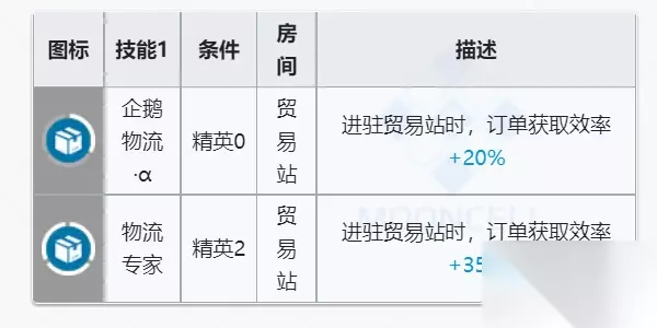 后勤技术1‘企鹅物流·α’:当能天使进驻交易站时,订单获取功率+20%(条件:能天使精0,房间:交易站) 后勤技术2‘物流通家:当能天使进驻交易站时,订单获取功率+35%(条件:能天使精2,房间:交易站)