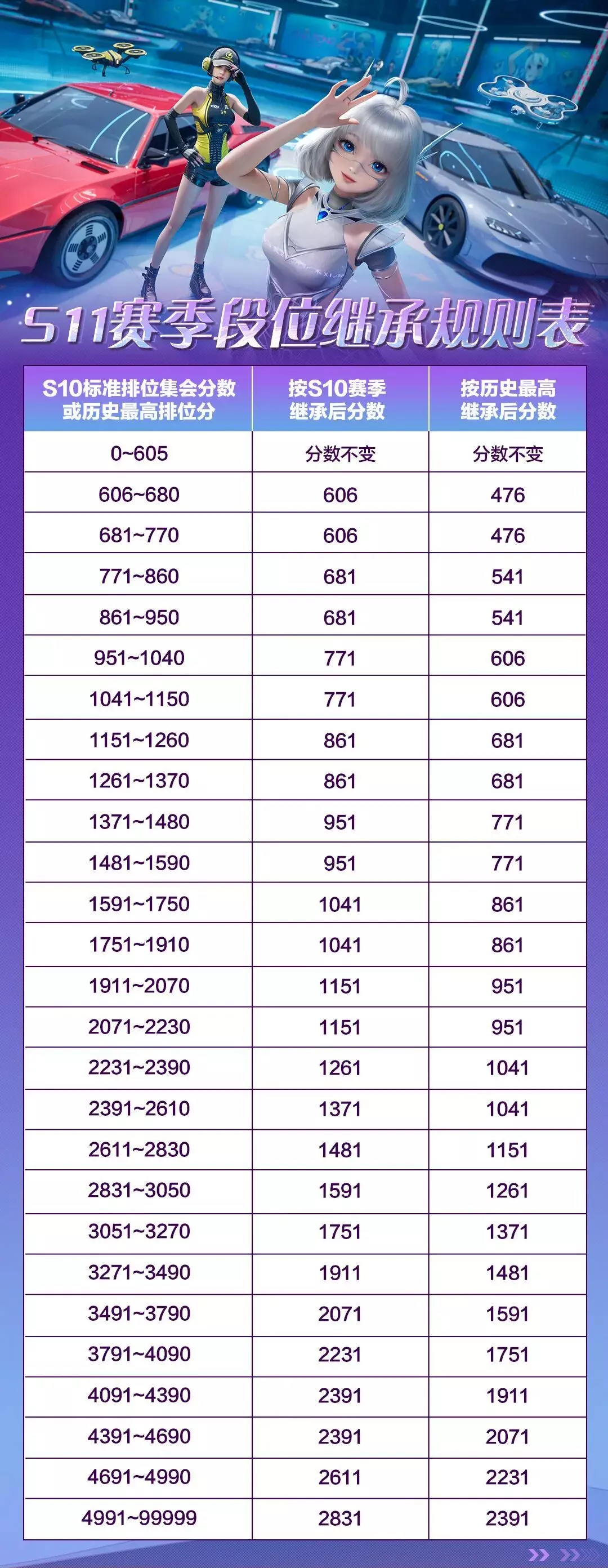 在S11赛季开启时,「限定排位」与「巅峰排位」分的继承规则保持不变。「圈速赛排位」分则不再继承,将在S11新赛季中重置。