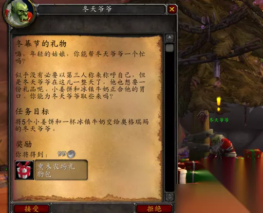 冬天爷爷就在圣诞树下呢,他会找玩家要5个小姜饼和一杯冰镇牛奶。那冰镇牛奶能在旅店拿到,小姜饼就得去旁边烟林牧场的NPC那儿买烹饪图纸才能做出来。