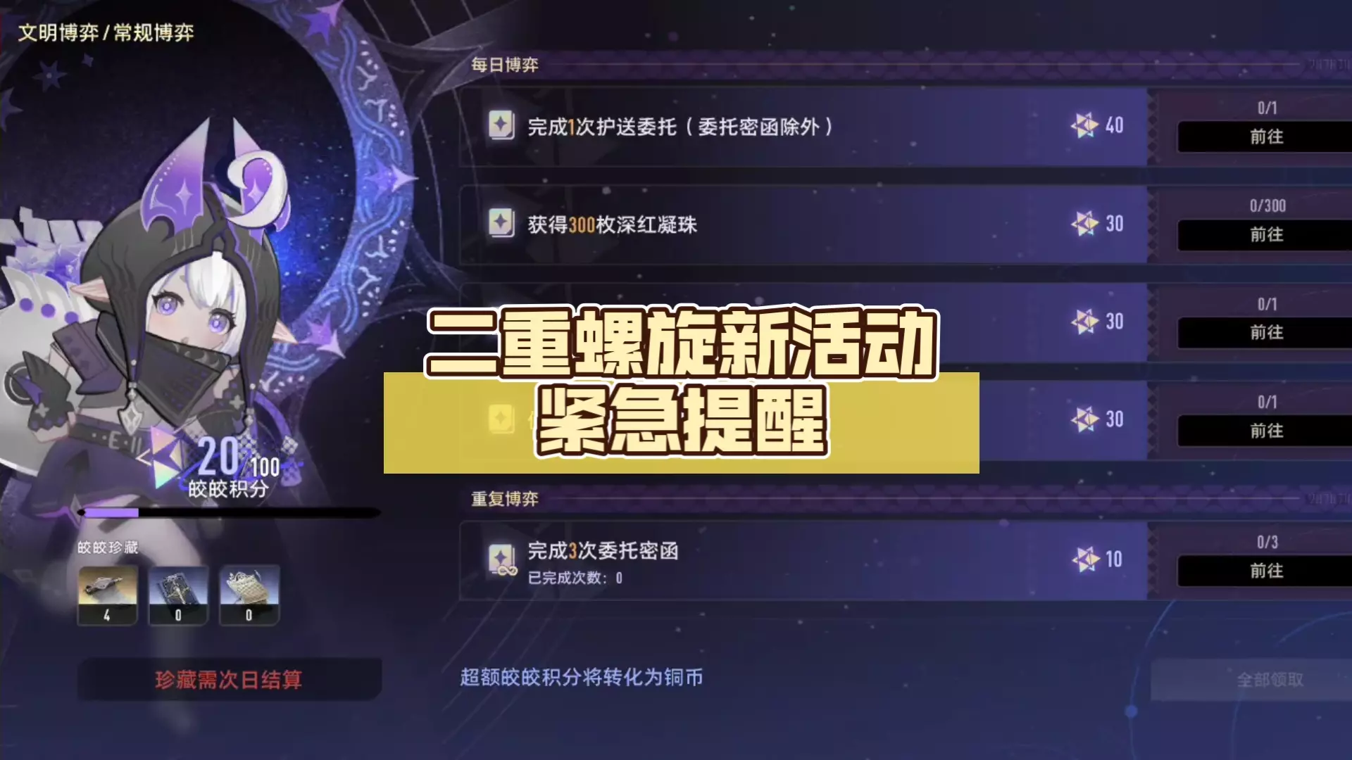 在【常规博弈】中,每天可以完成4个“每日博弈”任务,与2个可重复完成的“重复博弈”任务。