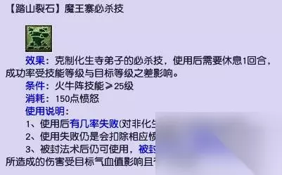 使用说明: 1、使用后有几率失败(对非化生寺弟子使用也会失败)。 2、使用失败仍是会扣除相应愤怒值但不需要休息一回合。 3、被封法术后仍可使用,被封特技后不能使用。使用成功所造成的伤害受目标气血值影响且有一定波动。 以上就是有关梦幻西游踏山裂石是哪个门派技能介绍,更多相关内容,敬请持续关注本网站。