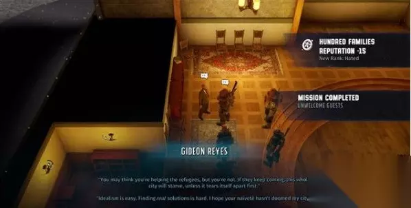 返回科洛雷多,找到城中的Mama Cotter。 与她交谈,询问她为什么要拐卖难民。 你可以选择逮捕她或继续允许她这样做。 1. 如果选择逮捕她,则会降低难民营的声望。 你将获得额外百家姓阵营的声望,并且Gideon Reyes也将作为一名政客加入到你的总部。 2. 如果你选择不逮捕Mama Cotter,那么你将获得难民营的声望,并且你可以从她这里获得一名机修师,之后这名机修师会到你的总部车库。 但是,与Broadmore Heights对接任务时,他会表示对你的做法很失望,你在百家姓阵营的声望会大大降低。