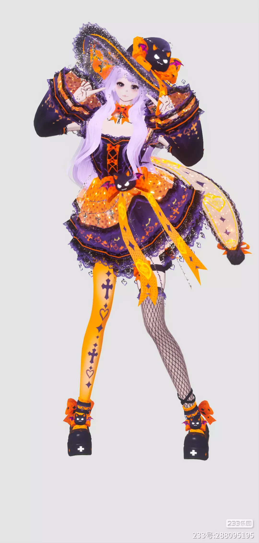 鞋子是厚底松糕鞋,以黑橙为主色,装饰着小幽灵与蝴蝶结,厚底设计增添复古甜酷感,同时拉长腿部线条。