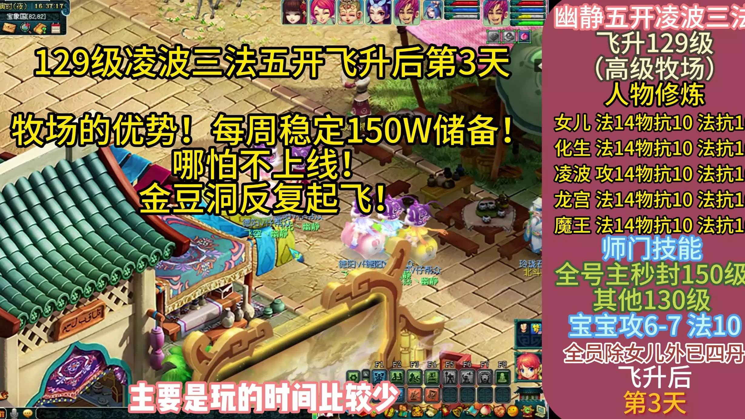 这是《梦幻西游》129级凌波三法五开飞升后第4天的内容,博主带来高级牧场玩法细节的流畅干货讲解,还展示了该五开号的人物修炼、师门技能等账号配置,演示牧场动物饲养、产出等操作。