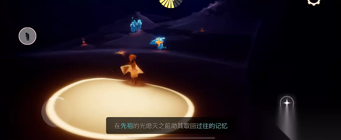 点燃先祖后,需要跟随黄色光点移动,这些光点代表先祖散落的记忆。光点通常分布在平台、洞穴或隐藏路径附近,例如云野的隐藏图洞口左侧平台、霞谷冰湖的亭子周围。触碰光点后,系统会提示与先祖一起取回过往的记忆,需引导光点飞向星星标记的目标位置。重复几次引导操作,直到进度条满格,即可激活全部记忆。