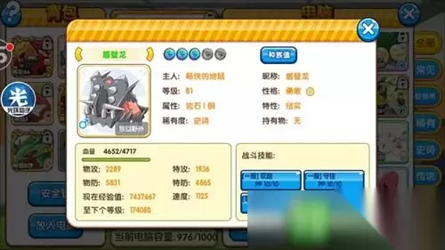(4)最后说说盾壁龙。在第4版精灵加入后,花园出现前,它只在中级狩猎场的热点中出现过一次。那时还是一天限3次进入机会的年代,我用了5天才得到它。起初并没有在意,直到有一次,发现它特性只有结实,自学合金爆裂,这才引起我的注意。花园发现这货之后,我捕捉了4只,其中契约了一只。这货捕捉来后直接就是特训3,特性只有结实,43级自学合金爆裂(1.5倍反弹当回合所受到的一切攻击)。虽然物防种族值168,特防138,但血量60实在有点低,不过2个4倍克制和一个2倍克制也足以触发结实特性。以一只81级绿色特训3的盾壁龙为例,没有契约时它的血量是4542(这里我有350的钢系契约加成,显示的数值是4717),触发结实后反弹最大可反弹6810的血量。(图12)橙色高突Mega精灵,血量不过14000左右,再难缠的主,只要2只盾壁龙,就足够解决了。在我没有古拉顿的时候,平民联盟的狃拉异常难打,后来我发现这货以后,用了它,至少狃拉可以残血,然后拼一次,狃拉一死,联盟就容易多了。和果然翁相比,这货由于结实特性,比果然翁多一层保险,也就少一份担心,尤其是在现在这个阶段,王者之路中,振奋精神的头巾、绷带无效的情况下。而且如果是王者最后一两层,完全可以用完就弃。后来我从花园捕捉到的5级盾壁龙开始培养时,发现它可以自学挑拨和守住。对于那些只会骚扰而不会攻击的骚扰货,一个挑拨就可以无忧处理。守住功能和冰鬼护一样,只是除了水招,漂浮鬼和幽灵气球都能联防,合金爆裂对于盾壁龙来说就成了主角。