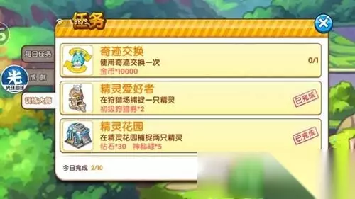 由于在捕捉精灵过程中,精灵会逃跑,扔球的命中率就变得至关重要。也许一个没命中,后面全中,精灵还是跑了。我曾经经历过扔球最多的一次,我扔了20个球,中间只有1个没命中,精灵跑了。一般精灵逃跑率和精灵的级别与状态都有关,白色精灵在第二种状态下就可能会逃跑,而绿色以上的所有精灵第一种状态就有可能逃跑。练习捕捉精灵,可以先从圈大的精灵开始捕捉起,如夜巨人,战槌龙,电鬼等,这样的精灵命中率会高一些,然后逐渐捕捉圈小的,如小海狮,椋鹰,梦幻等。这里不建议用辅助道具进行捕捉,一个是用钻,还一个就是大部分药品不会提高捕捉率,甚至会使捕捉率下降。在精灵“紧盯着你”的时候,你扔出10个球全中但均未收服,精灵可能照样不会跑。一般情况下,不用道具,不计扔球数,精灵的平均收服率大概为50%。 对于A,B键,最多不过是5秒内按7次A键,7次B键,一个是注意次数,别瞬间短路,忘了应该按多少次,还有一个就是手速。如果开始不熟练,手速稍慢,5秒内很可能按不了14次,这就需要多练习。一般我按第一个键时,普通按够,第二次按时先三连击,然后再普通按够,一个是为了防止过慢精灵弹出,还有一个也是怕4连击之后手抖或手贱,应该按5次的按了6次。 花园里的好东西很多,各种稀有度的精灵都有,其中也有野外没有或需要大量进化石才能获得的怪。这些怪,一方面可以让玩家只需要金币而不用大量进化石就能收集精灵,另一方面,契约精灵和固定交换的材料有很多在花园都可以直接捕捉,既节省了人物冒险刷NPC的体力,更不必为了进化石不足而过于发愁。在没有活动时,传说精灵只有3种,分别是电鬼、梦幻和玛娜菲。 特别提示: 1.花园精灵每逢大更新必出现坐标调整,个别时候可能会有精灵的调入与调出。不大更新时也会偶尔出现坐标变动,但一般精灵的种类不会调出。同终端无论客户端和分区,花园出现的精灵只要坐标不变就不变。即使同账号,不同终端登录也会有精灵的差别,但这种组合在位置上的变动幅度不大。 2.在每日的训练大师任务中,同样有可能出现花园捕捉精灵的任务。和其他类型的任务相比,这是最值得做的任务,出现就是赚到。任务如果出现,一般为:花园捕捉1只精灵给10钻石,5神秘球;捕捉2只精灵给30钻石,5神秘球,以刷出的任务为准。(图8)对比于其他送钻石的任务,消耗体力不是双倍大部分人不做,巅峰对决手头没有券也不值得做,其他任务全是以花钻为前提,只有这个不是。