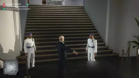 打开音响系统。躲在灌木丛中,而卡泽姆则来调查。让他关掉音响系统(这样其他人就不会调查了),然后制服他。穿上他的衣服进行伪装。 当你回到这里时,倾倒你可能携带的非法物品。 ⭐与奥马尔·加扎利的私人助理交谈