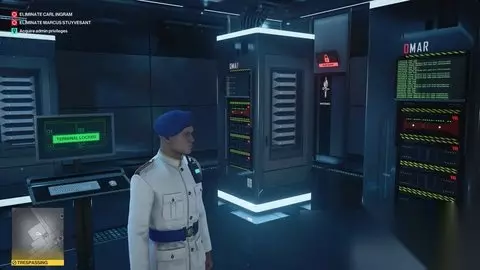 在服务器机房中,一个钥匙卡读卡器将从地板上弹出。刷服务器机房钥匙卡。其中一个服务器机架屏幕将从绿色文本更改为黄色文本。与该服务器交互以破坏服务器并获得管理员权限。 使用终端并点击所有按钮-禁用摄像头,打开电梯门,重新安排会议以及存入应急资金。 ⭐伪装成顶层公寓的警卫//渗透到顶层公寓的地板上