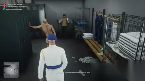 右转,进入厨房。继续向右走,找到一个更衣室——第一扇门是锁着的,但稍微靠得更远的门是开着的。新兵在那里,与活动工作人员的一名员工交谈。把他们俩都打晕(用扳手),把他们的尸体藏在左边的板条箱里。 从右边的长凳上拿起转会文件。 ⭐在安全办公室展示自己//在安全办公室等待马库斯//将您的命令交给史岱文森