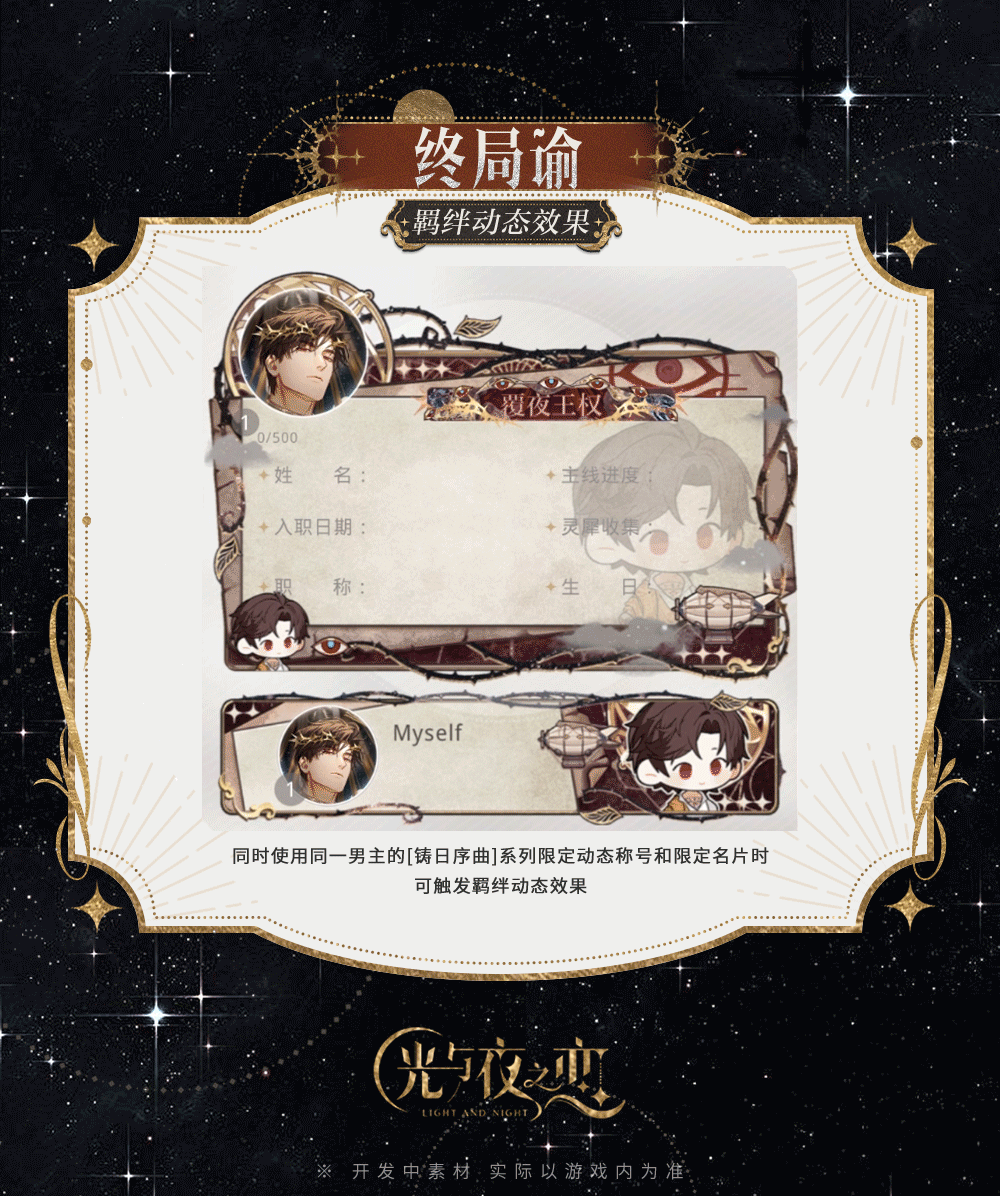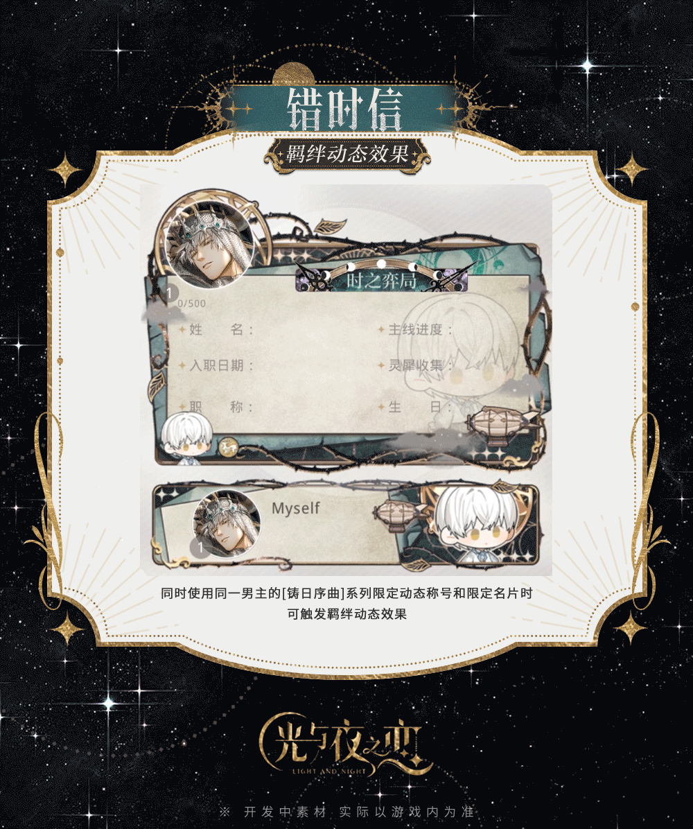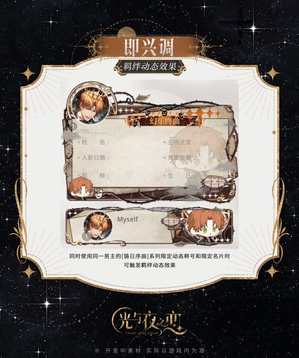 在[限定收信・铸日序曲]中完成限时计划,可将获得限定名片及限定动态称号奖励。同时使用同一男主的[铸日序曲]系列限定动态称号和限定名片时,可触发羁绊动态效果。