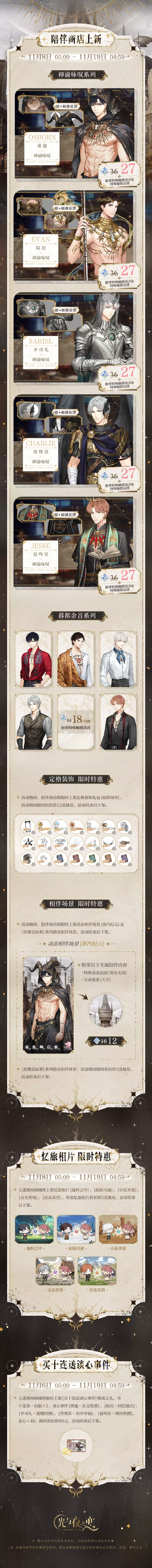 ✦ 11月8日 05:00 - 11月19日 04:59期间,陪伴商店将限时上新[神谕咏叹]、[暮都余音]系列百搭服饰、定格装饰礼包[银辉颂章]、动态相伴场景[蒸汽纪元]及[星渊竞标赛]系列静态相伴场景,活动结束后下架。