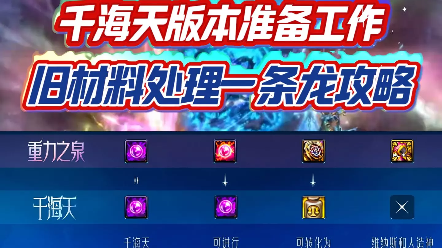 DNF千海天4.23版本更新前所有旧材料如何处理-新搬砖副本收益讲解/4K超清60帧 搬砖数据来源:B站up主:骑乌龟的蜗牛z 讲解:B站up主:杨浩瀚吹啊吹 (一)旧材料 (1)强烈建议保留 大深渊票(更新后1比4兑换深渊票) 三色令牌(其中神器令牌更新后能1比15换成深渊票) 旧虚无之魂(更新后可以留着换武器,跨界,或者兑换成新虚无之魂) 迷雾工商协会硬币(更新后可以兑换新虚无) 三色虚无提取剂(更新后依旧能提取旧虚无,可以放着) 妖气具现之行,更新后统一变成新歼灭票-破旧的巡礼之证 妖气残痕,更新后统一变成巡礼之印,分为账号绑定和可交易 闪闪明的3种礼袋,可以开启变成可交易的妖气具现之行 各类永久账绑定深渊票,留着开服刷新深渊 (劣化徽章碎片,更新后不要换成五耀星光 要换成灿烂徽章,分解拿五耀星光,这样更多) (2)建议保留 雾岚团本材料-黄昏浸染的残垣,更新后听说重置史诗令牌兑换 次元铃铛,更新后可以兑换新虚无 (3)全部开启,不予保留 纳波尔团本材料-噩梦结晶,全部换成罐子,价格相同开什么都一样 纳波尔武器材料-无知权能残痕,全部换成大深渊票,开服大深渊票换成小深渊票 (二)新搬砖本收益 (1)无需门票-生命巡礼,但是据说入场名望是全服前70%,首周开服是6w2 188pl无85称号收益为45w+24次摸金机会,大部分为1个可交易巡礼之印 (2)需要门票-光辉巡礼 收益比现在妖气更高 188pl无85称号纯金币收益520万+1200个账号绑定巡礼之印 (三)耕耘积分商城有宠物称号跨界石 需要跨界的玩家要提前解锁称号