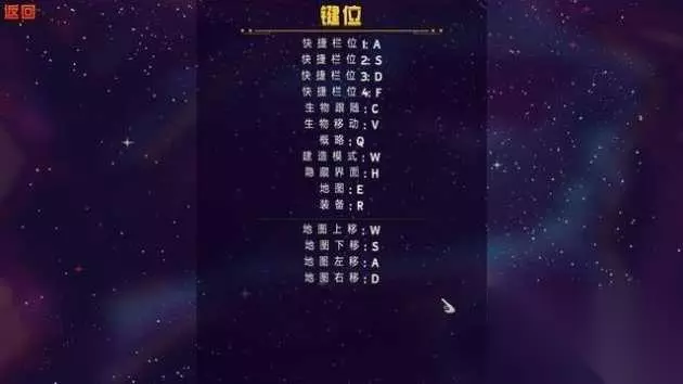 键位操作 WASD键:显示地图时,控制地图的移动; 移动鼠标:通过点击控制人物行动、建造和战斗; ASDF键:主界面时,作为物品道具的使用快捷键; C键:命令生物跟随; V键:命令生物移动; Q键:任务; W键:建造模式; H键:隐藏界面; E键:打开大地图; R键:装备界面;