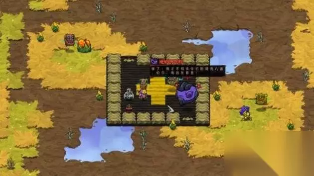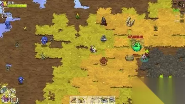 step3.Crafty老祖母家门前有一个晶石,触碰后,Flux会在短暂时间内获得一对飞翼,能够让他跨过水域,不过还是建议在老祖母家门前搭建木板度过水域。 然后将盆栽太阳蘑菇交给老祖母,她会建议Flux去实验室走一趟。