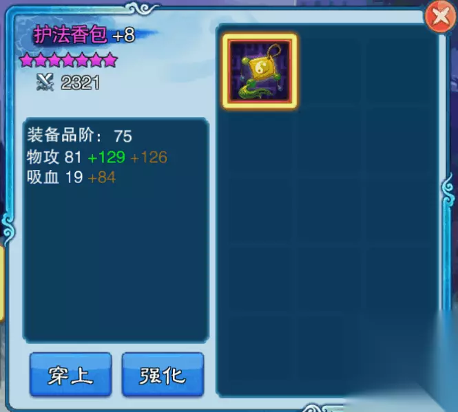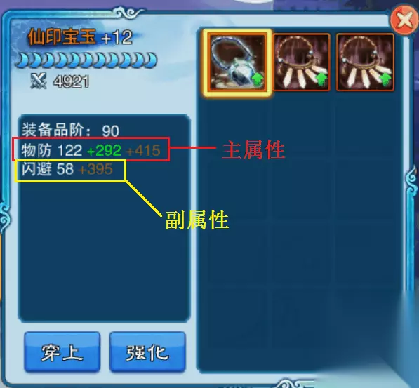 每个装备都分主属性和副属性两个属性, 武器 主属性--物攻、仙攻 副属性--暴击、命中、物防/仙防穿透 防具 主属性--物防、仙防、生命(必带) 副属性--物伤加成、仙伤加成、物伤减免、仙伤减免 首饰 主属性--物攻、仙攻、物防、仙防 副属性--物理/法术暴击、物防/仙防穿透、命中、治疗加成、收治疗加成、闪避、吸血 四、装备强化 青色装备只能强化到+1,蓝色装备可以强化到+5,紫色装备可以强化到+9,橙色装备可以强化到+12,各种颜色的装备都可以升星到+13. 装备每次强化会增加主属性20%的属性,每次升1星会增加装备主属性20%的属性,副属性63%的属性。 五、装备选择 讲了那么久废话,现在让我们言归正传,回到我们选准备的话题吧!!!! 首先,在70级以前,我建议玩家,有什么装备就穿什么装备,60级以前先凑齐5套装备,如果有多余的装备不要溶解,60级后先凑齐斗仙的15套装备再说, 最重要的是: 在70级以前,每次品剑、押镖和演武场出新装备兑换只换2件,如果你是带T的队伍,就给T一件,主力输出一件;没T的队伍,就给2个主力输出,70级以前装备淘汰很快,基本上5天左右就换一批,没有必要浪费那么多资源去换装备,建议都换升星石。如果是土豪哥哥资源多,请无视我的建议。 70级以后,装备的兑换根据你自己获得资源的高低决定。下面开始讲解每个人物的装备选择。 1、肉盾(姜承,龙溟,太武,阎王等)