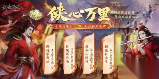 晨曦熹微庆盛典,执剑风华聚江湖! 西山居经典剑侠情缘系列游戏--《剑网2》十九周年庆资料片“侠心万里”9.26正式发布!周年庆资料片带来新科举考试、兵魄洗炼玩法、周年庆回馈活动等丰富内容,十九周年新服“苍龙逐日”也在当日15:00火爆开启,十大福利活动助飞江湖。截止到发稿,周年庆福利仍在放送中,欢迎新老玩家体验,开启武林新篇章!