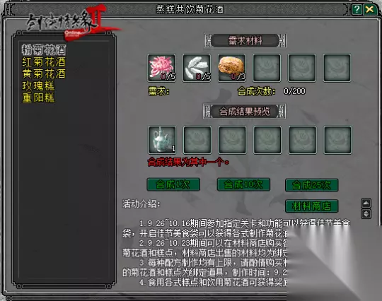 【做重阳糕 饮菊花酒】 大侠参与游戏副本及塞北金戈系统,还可以额外获得制作菊花酒和重阳糕的材料,在“游戏活动大使”处领取食谱就可以烹饪民俗美食啦。
