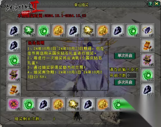 【共庆佳节 幸运抽奖】 10月1日-10月23日期间,大侠右键使用【国庆欢乐礼盒】、【国庆钻石礼盒】可以进行幸运抽奖,快来试试手气如何。
