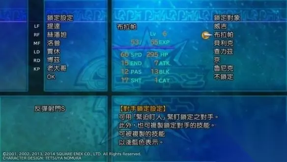 安宁平原的全能选手,数值高的丧心病狂,安排她当前锋就是为了前场快速断球。缺点是没有射门技能难以突破18ca的大关。 4.左后卫 速度非常快,数值也不错,但是持球不够高注定当不了前锋。就算当也太拖时间了。专门负责给tidus传球。 之后就是右后卫用自己队里面的金毛黑人就可以,左前锋万年不变的tidus。 另外为了打假球务必留下持球只有3的那个红毛后卫,丢球就靠他了。 二,特技的安排 tidus 捷克特射门必备,这个不用多讲,神技。面对albead的时候第二技能要带上幻光射门拼人品。之后还有空格就带一些学来的截击技能,没有也无所谓。 中场ropp 速度不快所以第一技能好(和谐?)战模式是必要的,第二技能可以选择吸血冲撞或者其他的技能,无伤大雅。 右前锋svander 自带的唯一技能剧毒冲撞X就可以了,专业断球。敢走右边就算是ronso也能断。 其他的随意。 三,前期准备 前期主要的问题在于albead的18ca守门员,实在是叼,贴在脸上捷克特都进不了。要进球需要tidus到达6级,这时捷克特射门有18的 st值,就可以一战了。所以拿wakka的od2的杯赛前先存档,看到分组自己要是和albead在一个半区,还少打一场,那还是读档或者重置数据吧。要么就先下联赛练练,估计没人会这么干。 最好是albead在另外的半区,还少打一场。这样的是可以直接打杯赛的,对付其他队伍tidus一场升个2级毫无问题。 后期就再次重置拿od3的时候无所谓了,联赛了不起平局呗。反正第二次碰你的时候tidus肯定过6了。 四,基础操作 我发现有些新同学连基础都不知道,必要的操作有2 其一,三角键切换操作方式和队形,一般切成手动A和一般队形。 其二,方块键停球,这个时候可以进行传球,带球,射门的操作。 其他的什么技能复制啊啥的都可以无视。 五,实战演示 以综合实力比较强力的albead做个示范,我这个队伍是打了一个联赛的,数值就不要吐槽了。 开球,albead先手,但是面对这种前场截击神仙也得丢球。