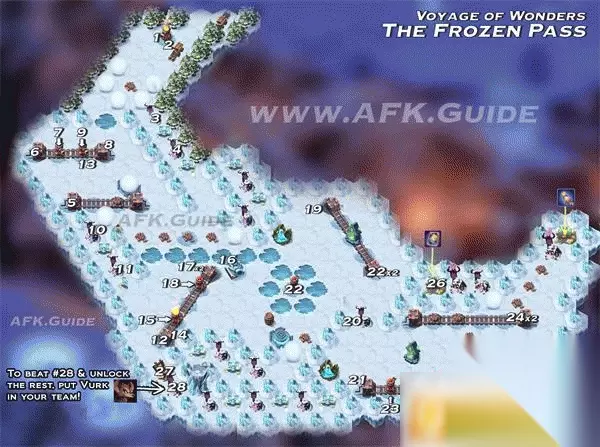 雪踪迷径路线 1.2 需要按炮台发射两次,炸开前方的雪球,点燃9的炮台。 3.4 击败路上的敌人并拾取小宝箱 5.将爆竹向左移动一次 6.将炮台向左移动一次 7.炮台发射,并击中先前移动的爆竹,炸毁雪球。由于缺少雪球的压力,机关复位。 8.使炮台向右移动一次 9.发射炮台,击中冰面上的爆竹并引发连锁反应,从而使16上方的雪球炸开,可以继续前进。 10.11 击败路上的敌人并拾取小宝箱 12.将炮台向下移动一次,使炮台位于轨道中间 13.发射左上方轨道上的炮台,炮弹会点燃第12步移动的炮台。 14.将炮台向下移动一次,使炮台位于轨道底部 15.发射炮台,点燃右端的木桶,打开一条通道。 16.点击雪球发射器,发射的雪球将会卡在机关上,这样右边被冰面包围的炮塔将会出现一条道路。 17.移动炮台两次,使炮台位于轨道顶部。 18.发射炮台,点燃被冰面包围的炮台。 19.移动绿色传送门,使传送门位于轨道顶部 20.击败挡在路中间的敌人 21.移动炮台,使炮台位于轨道最左端 22.发射被包围的炮台,炮弹穿过传送门。点燃第21步移动的炮台。之后再次移动绿色传送门两次,使传送门位于轨道底部, 23.发射炮台,炮弹回穿传送门,击中机关周围的爆竹,炸开通路。 24.移动爆竹2次,使爆竹到达轨道最右端。 25.移动炮台,使炮台位于轨道最右端。发射炮台,点燃上方一连串的爆竹,炸开通路。 26.击败敌人获取两个大宝箱。 27.28击败特殊敌人,需要准备沃尔克或斯科雷格,两个英雄等级、品质不限,需要上阵,不能仅存在于自己的英雄池当中。没有的小伙伴请提前找好友借一下。