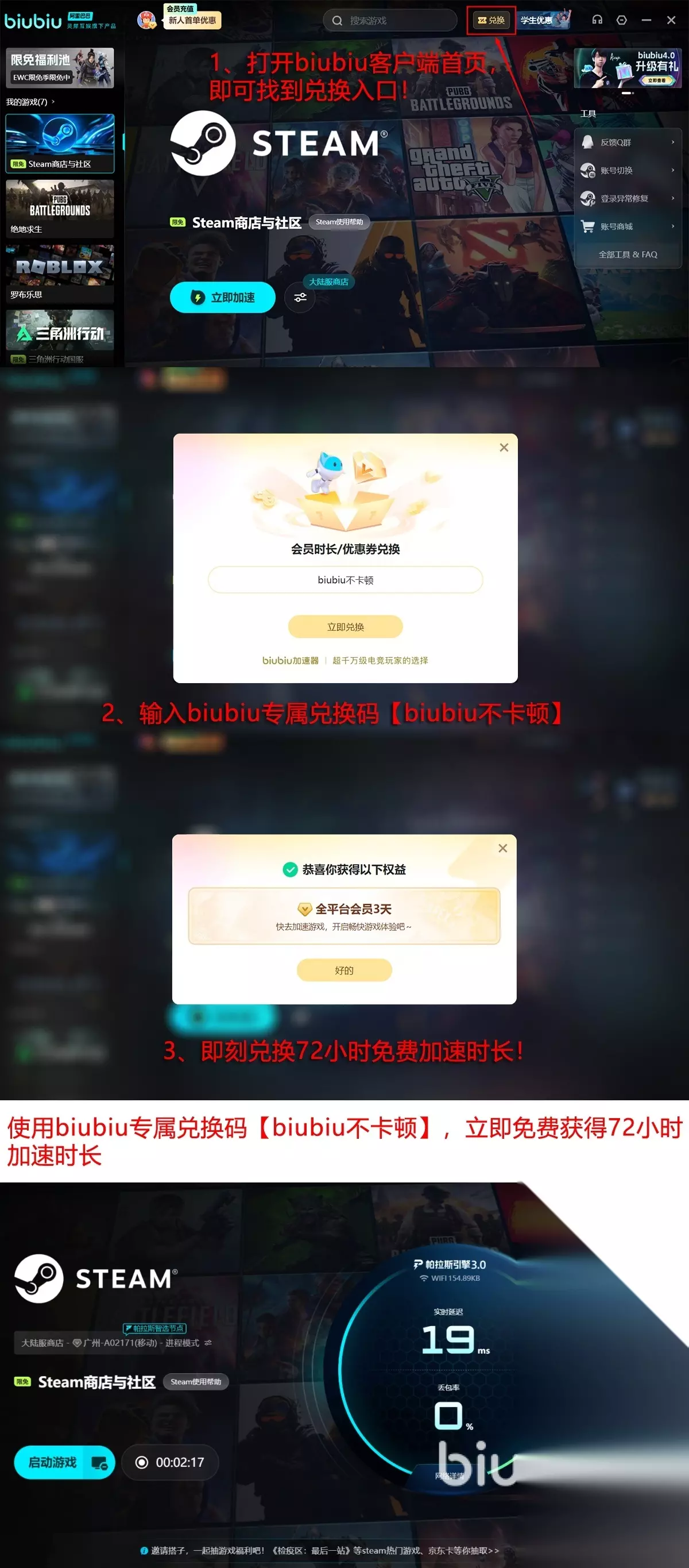 很多玩家没有用过加速工具,都会对此有疑惑。现在新人来注册biubiu,登录即可领取24小时的免费体验时长,亲手感受其搭载的自研发帕拉斯引擎3.0,好不好用,一测便知道。想要体验更多,平台上的用户都可以来输入【biubiu不卡顿】口令码,立即领取三天免费加速时长。新人在两项福利叠加后,最高可享96小时免费畅玩,零成本就能感受到专业级别的优化的手感。