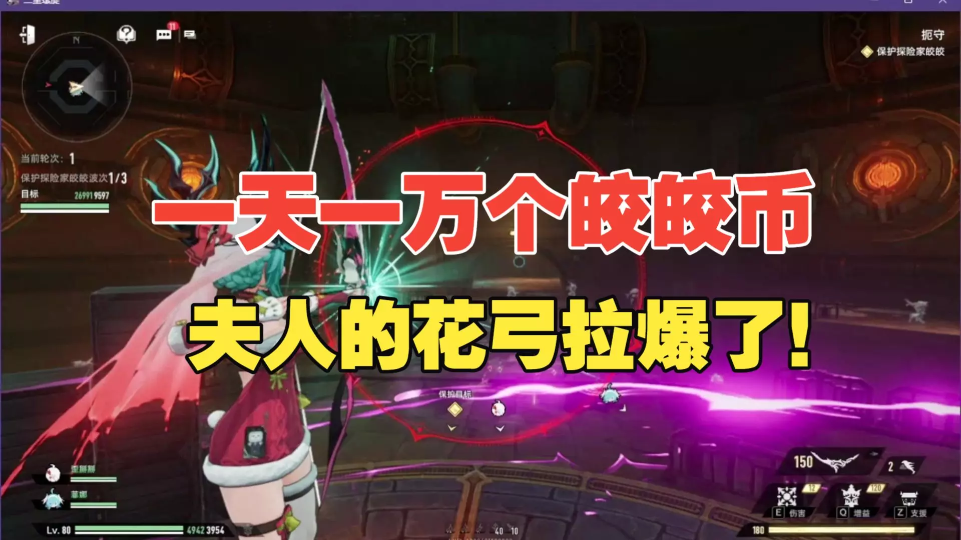 这是一则游戏挂机攻略帖,分享了皎皎币99挂机玩法,能稳定获得130+分钟的皎皎币,展示了游戏中保护探险家皎皎的厄守玩法轮次战斗画面,还有战斗增益选择界面。