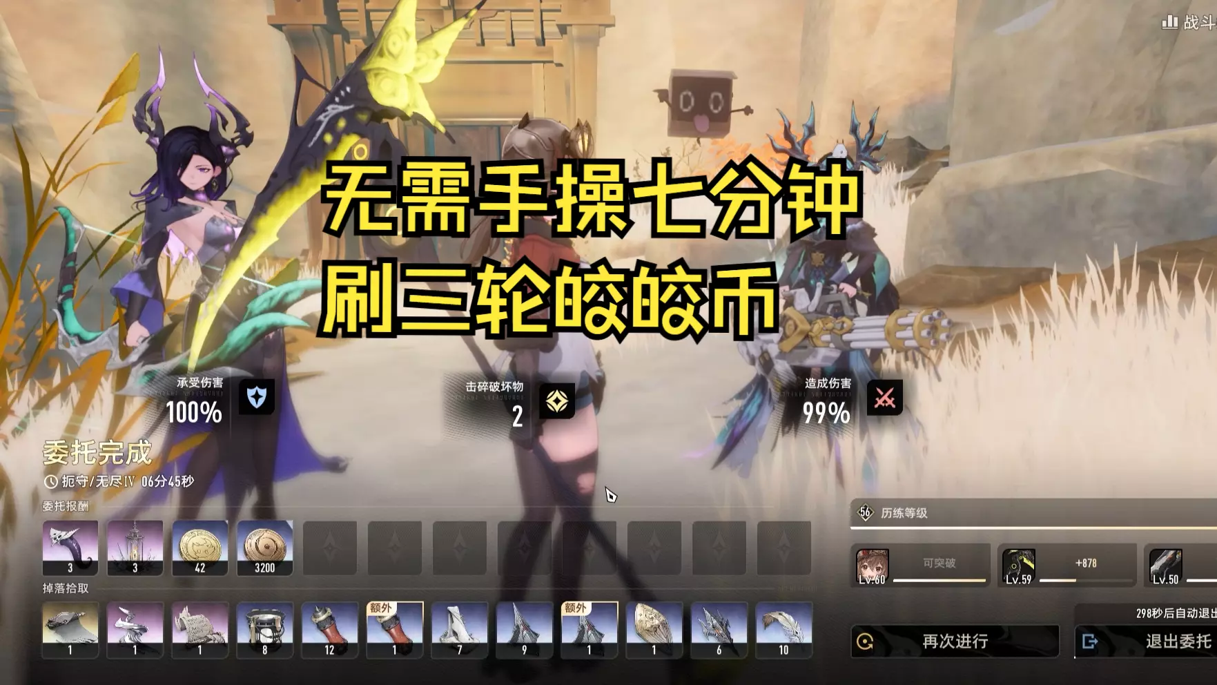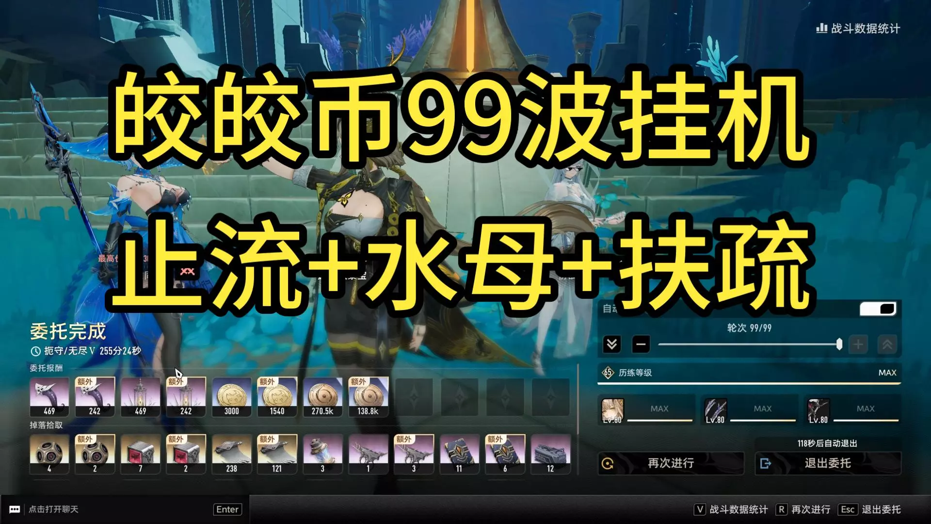 99波等雷队毕业再去尝试了。 目前主控2命止流+水母扶疏阵容,25波时挖机被拆。 纯挂机流皎皎币副本,主控止流6命对比2命提升越1.2倍,体感50波随便挂。