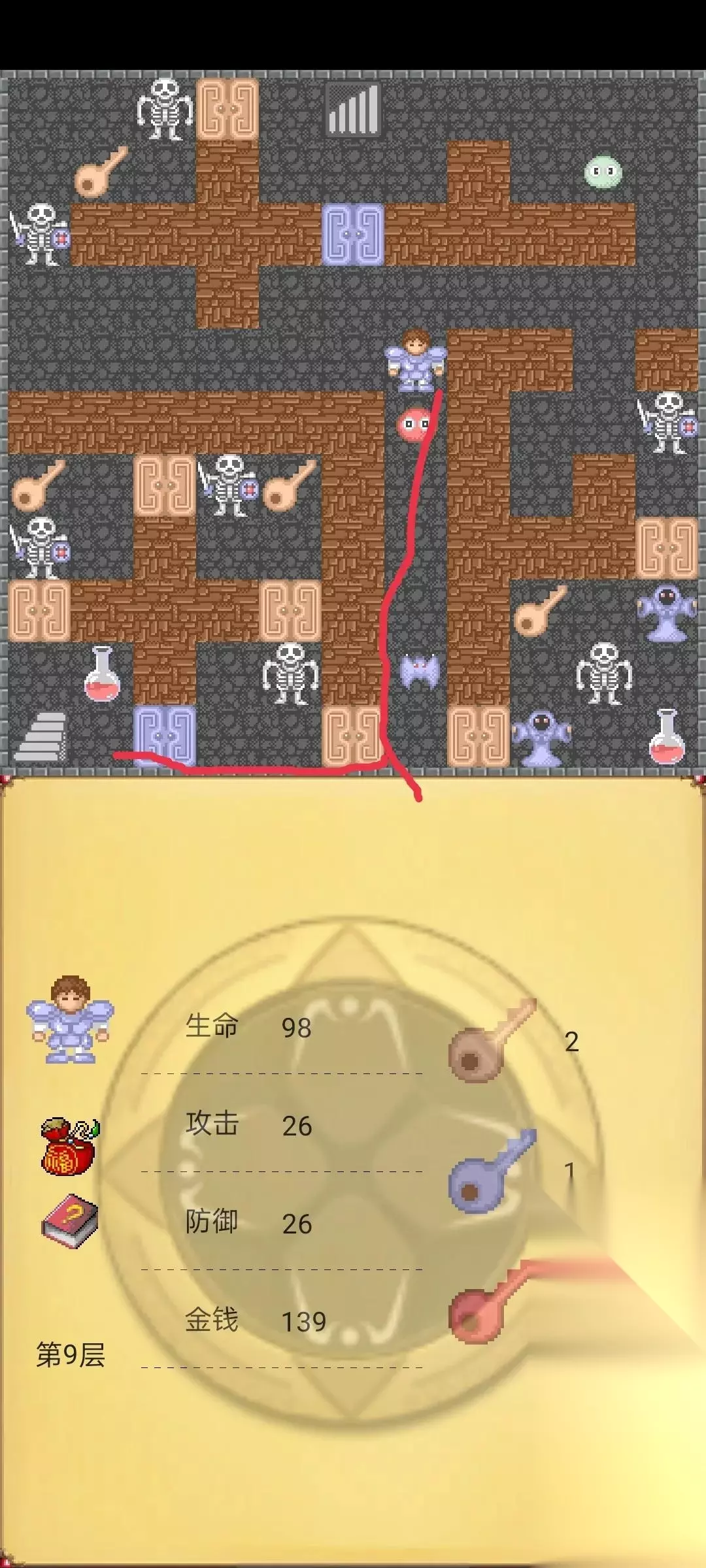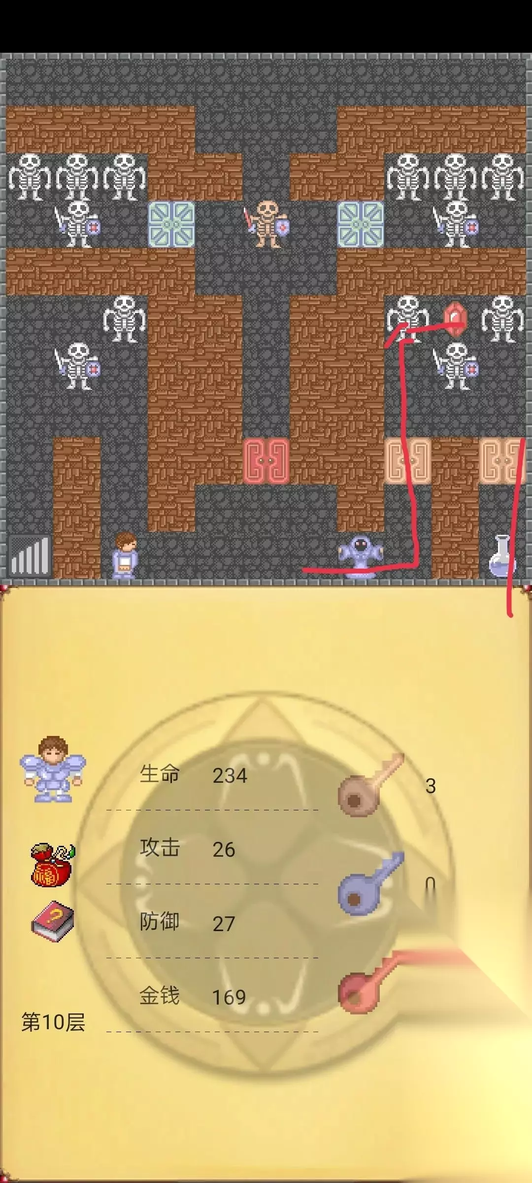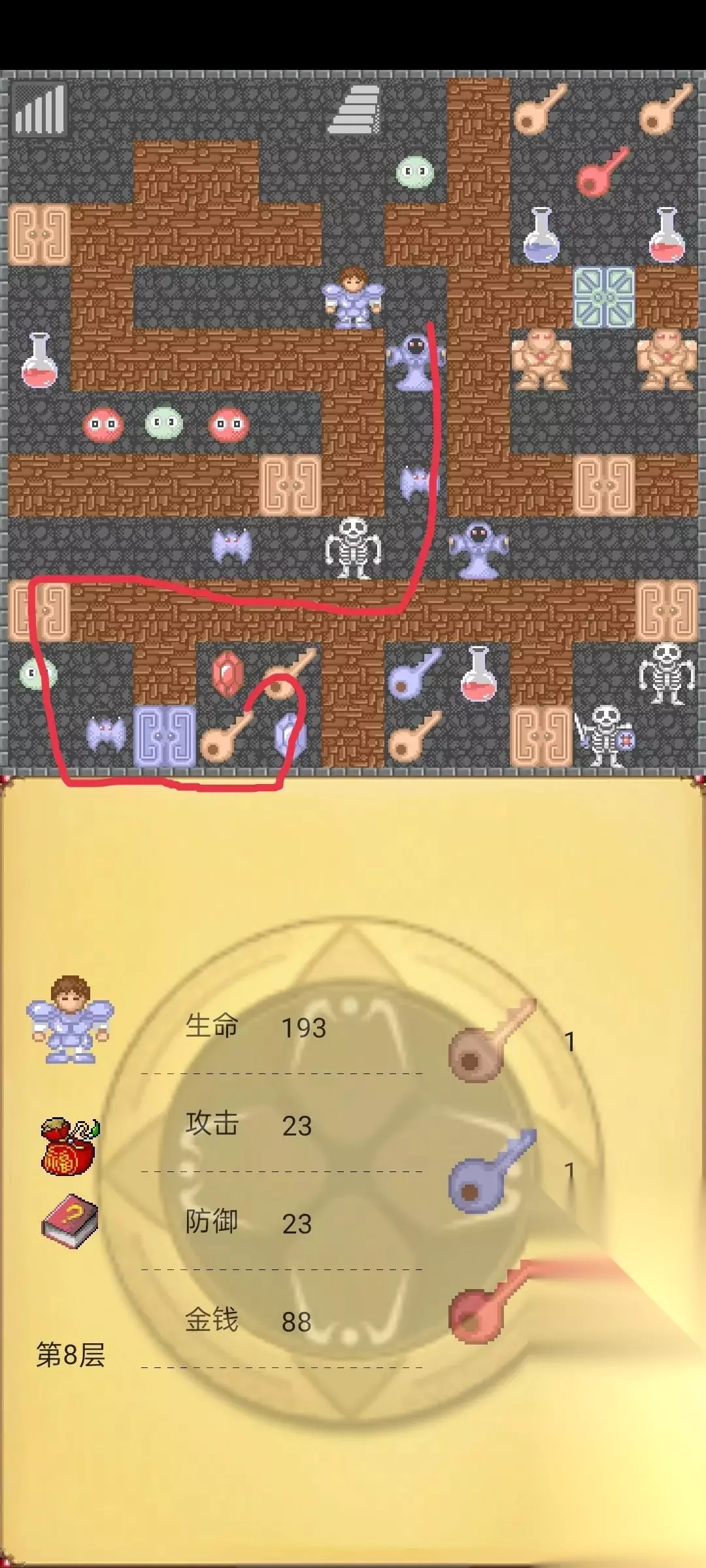 接下来在回到第10层按照下图路线走,这时候我们已经把前10层所有的红蓝宝石到手了(攻防都27),这时候去第8层击杀下图守卫获得红钥匙。