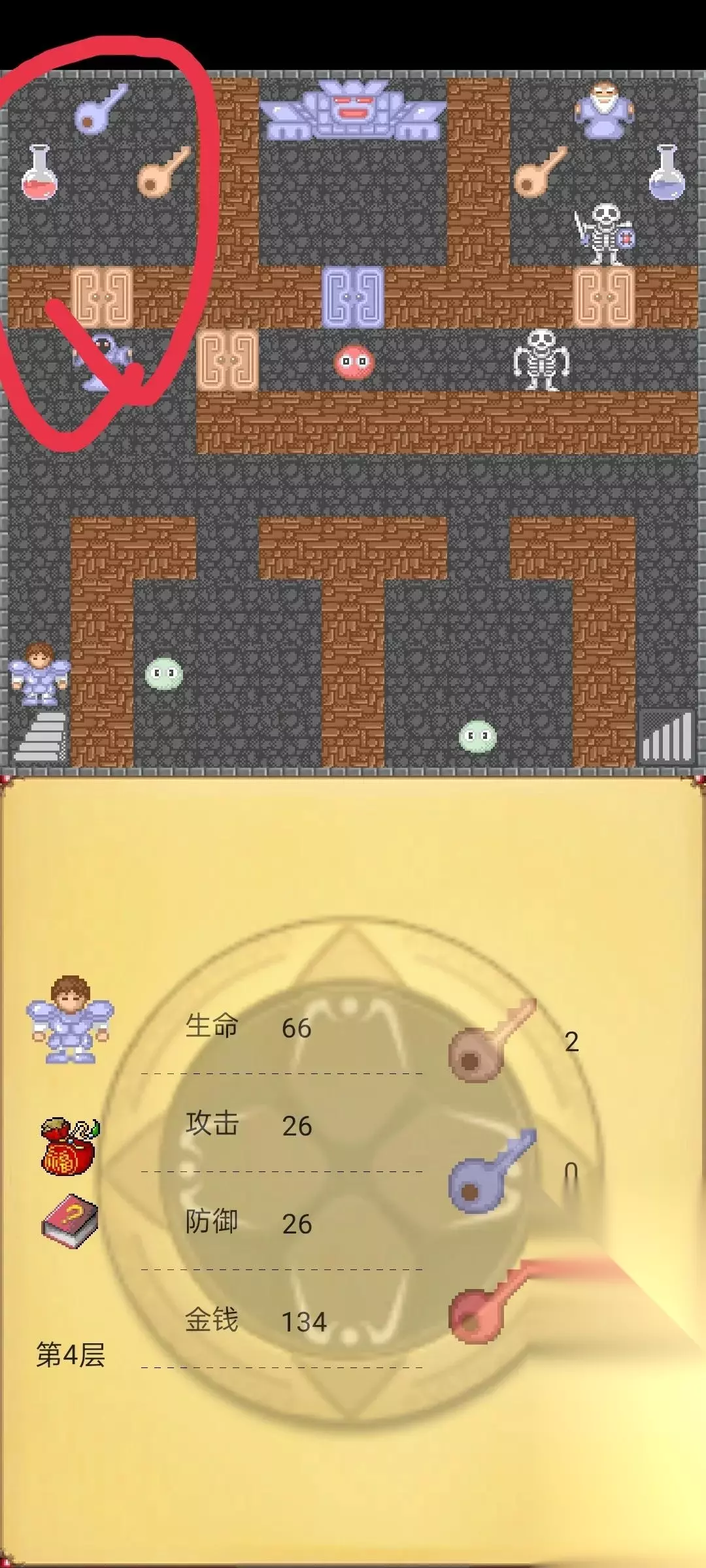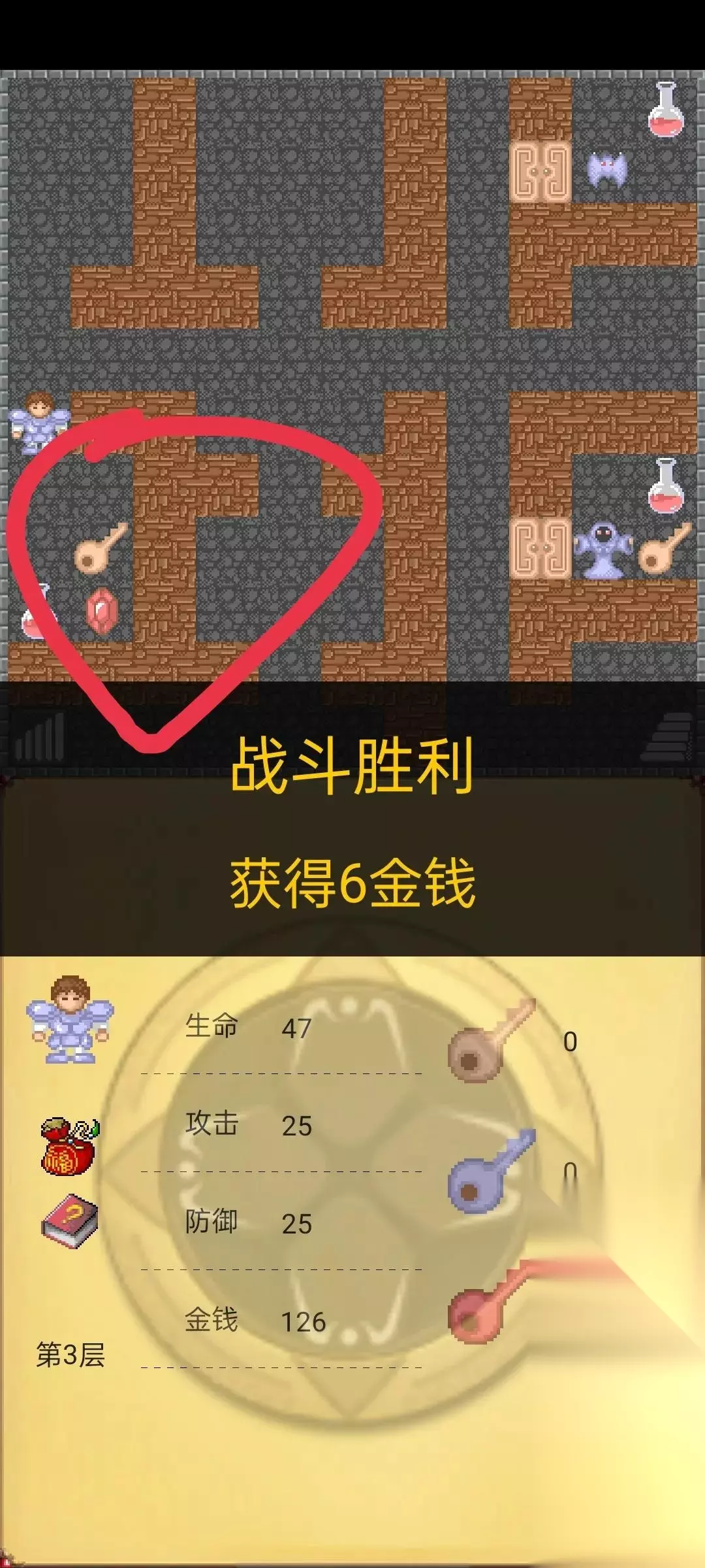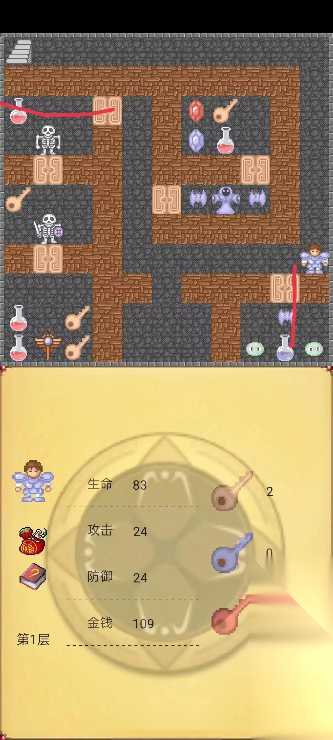 接下来在回到第10层按照下图路线走,这时候我们已经把前10层所有的红蓝宝石到手了(攻防都27),这时候去第8层击杀下图守卫获得红钥匙。