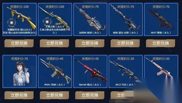 积分兑换 可兑换奖励 100积分:觉醒版烈龙-悦心(永久)+烈龙-悦心金色光效兑换券(永久)、王者之影(永久)王者之影金色光效兑换券(永久) 70积分:加特林-炼狱(永久)、炼狱-星空 皮肤(永久)、AK47-黑鲨(永久)、空(永久) 45积分:M4A1-死神(永久)、Barrett-极光(永久) 30积分:AK12-天启(永久)、QBZ03-金色蔷薇(永久) 以上就是本期233乐园小编为各位小伙伴们带来的攻略了,希望大家能够喜欢哦。来233乐园安卓网,你想玩的游戏全都在这里。