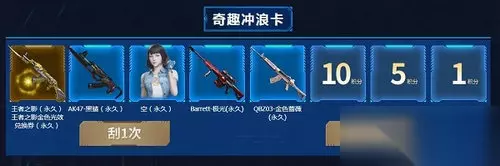 奇趣冲浪卡 奖励一览: 王者之影(永久)王者之影金色光效兑换券(永久) AK47-黑鲨(永久) 空(永久) Barrett-极光(永久) QBZ03-金色蔷薇(永久)