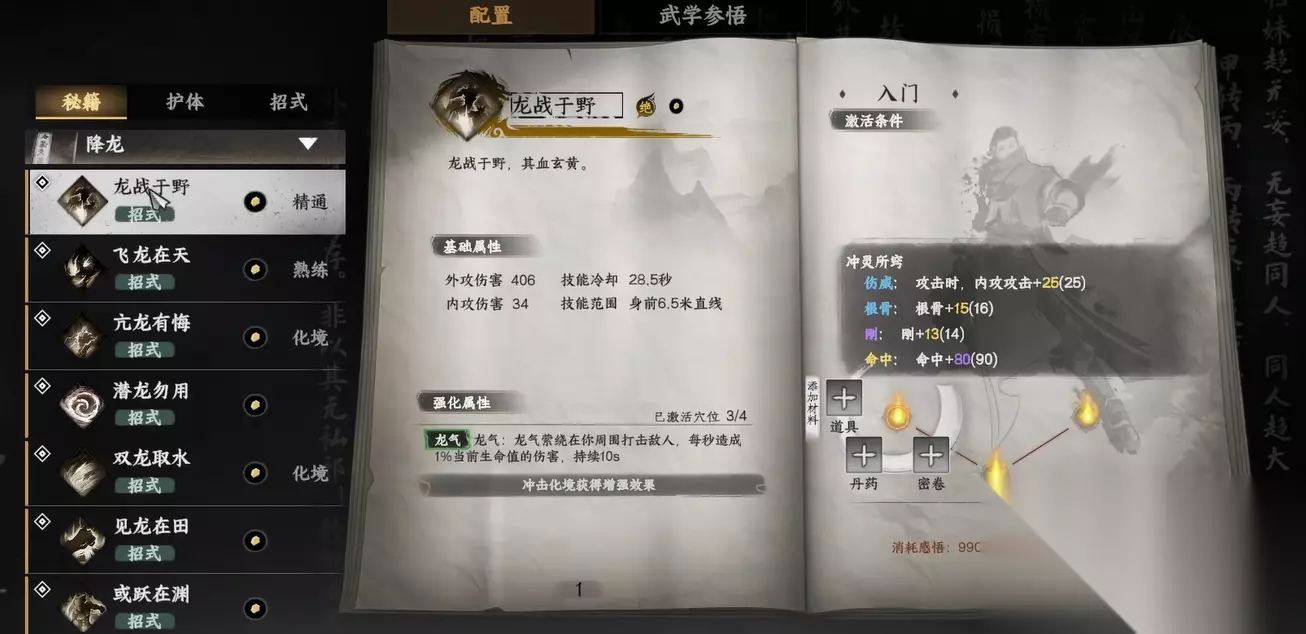 下面说说关于降龙十八掌的连招问题。每一个连招的第一招都是至关重要的,尤其是在冲脉时,我们需要确保第一招能够给敌人造成最大的伤害。在选择连招时,通常需要选择伤害最高的武功放在第一招,并对其进行冲脉强化。比如“龙战于野”,它的外功伤害极为可观,搭配刚属性的提升后,打出的每一击都异常强劲。对于连招的第二招,推荐选择“亢龙有悔”这样威力强大的招式,以确保在连招中断的情况下,仍能发挥出极高的输出。
