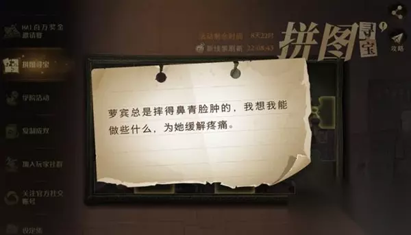 哈利波特魔法觉醒10月10日的线索之一是罗宾总是摔得鼻青脸肿的,我想我能做些什么,为她缓解疼痛,根据罗宾大家有没有猜到这次线索的拼图位置,小编整理了一下,有需要的玩家和小编一起来看看吧。