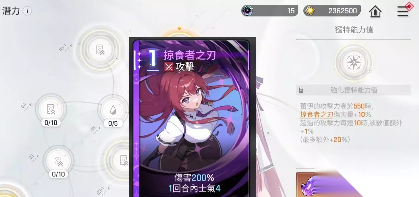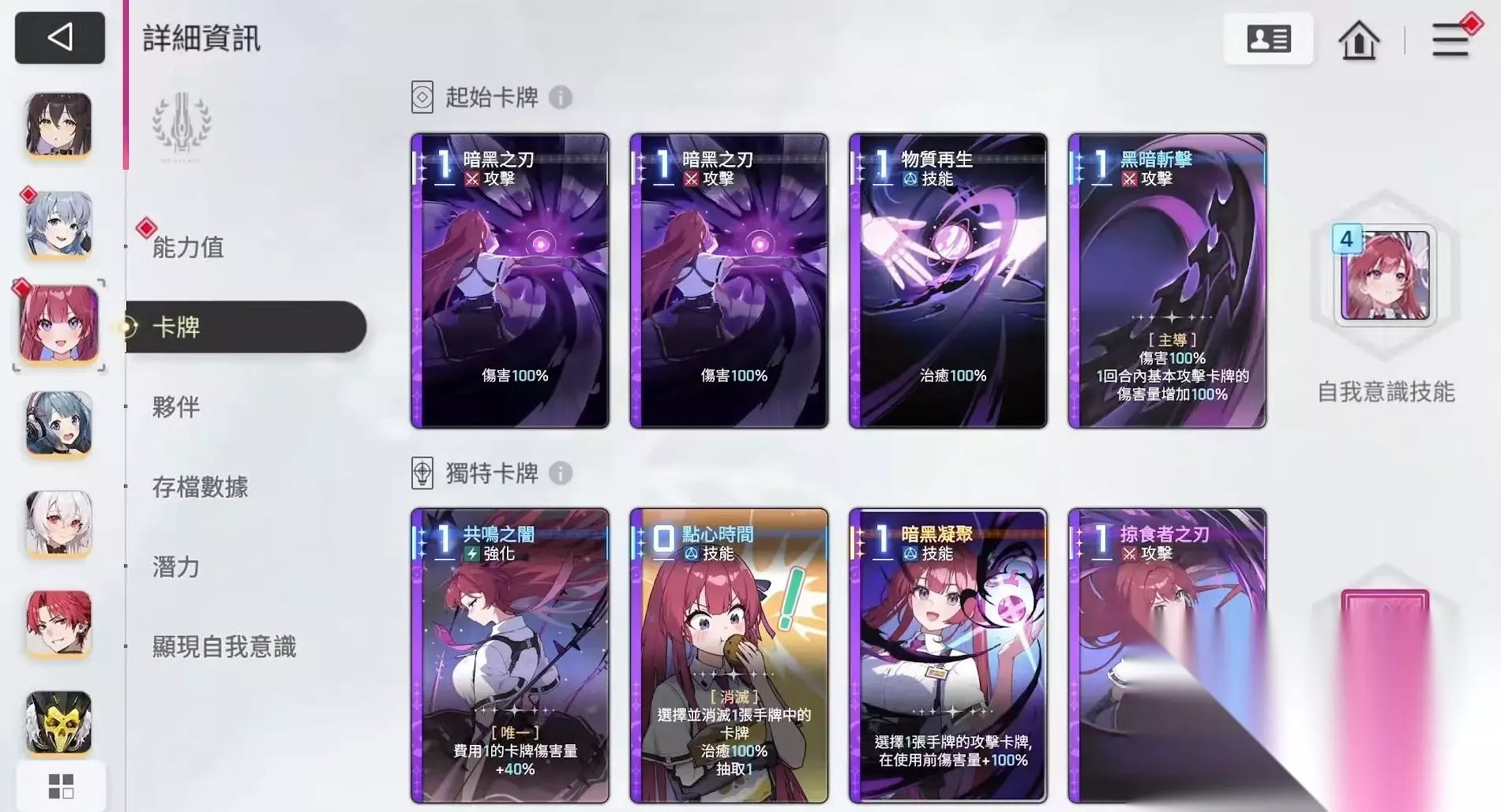 蕾伊的起始卡牌是由两张一费攻击和一张一费技能组成,攻击牌暗黑之刃可造成106%的伤害,技能牌物质再生,效果是根据防御属性来进行治疗,治疗量和队员当前的压力值相关。特殊卡牌方面,第一张是黑暗斩击,使得回合内基本卡牌所造成的伤害提升。第二张是共鸣之暗,使得费用是一的卡牌伤害量增加40%,这就意味着基本卡牌中的伤害牌就可以享受到此效果。