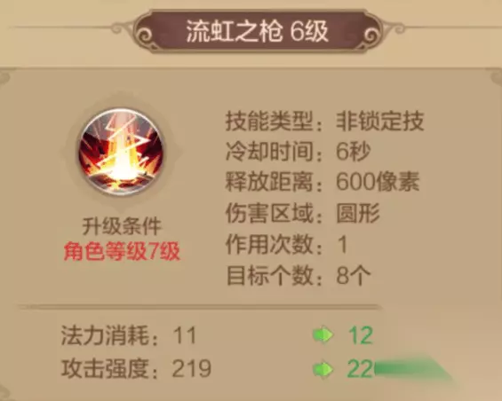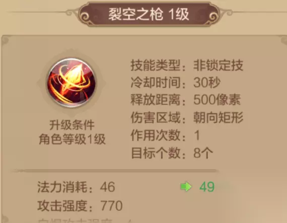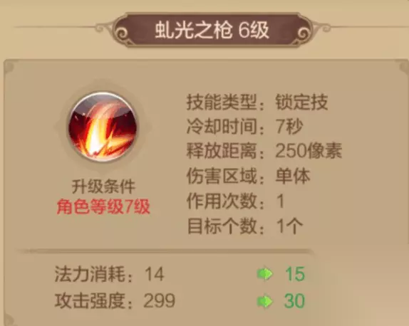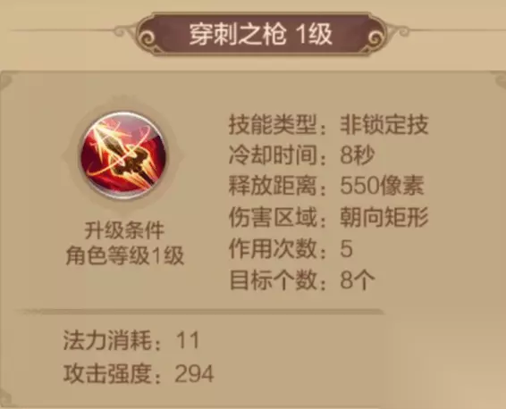 【技能推荐】 (一)普通技能 虬光之枪 1级解锁的技能,冷却时间7秒,对选中目标造成1次物理伤害。 其被动技能附带[溅射]及提高自身物理攻击。千万别小看1级就能解锁的技能哦,其攻击力度其实并不小,而且加上被动技能提高自身物理攻击,在PVP的时候可以说是很好用了,而且冷却时间也较短,所以该技能必带。