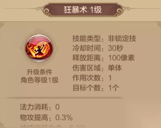 怒火杀意 32级解锁的技能,冷却时间9秒,为自身施加[怒火]状态,物理攻击提高,但物魔双防都会降低,持续5秒。 这个是战士的BUFF技能,PVE和PVP时必带的技能,其被动技能还可减少怒火杀意防御降低。