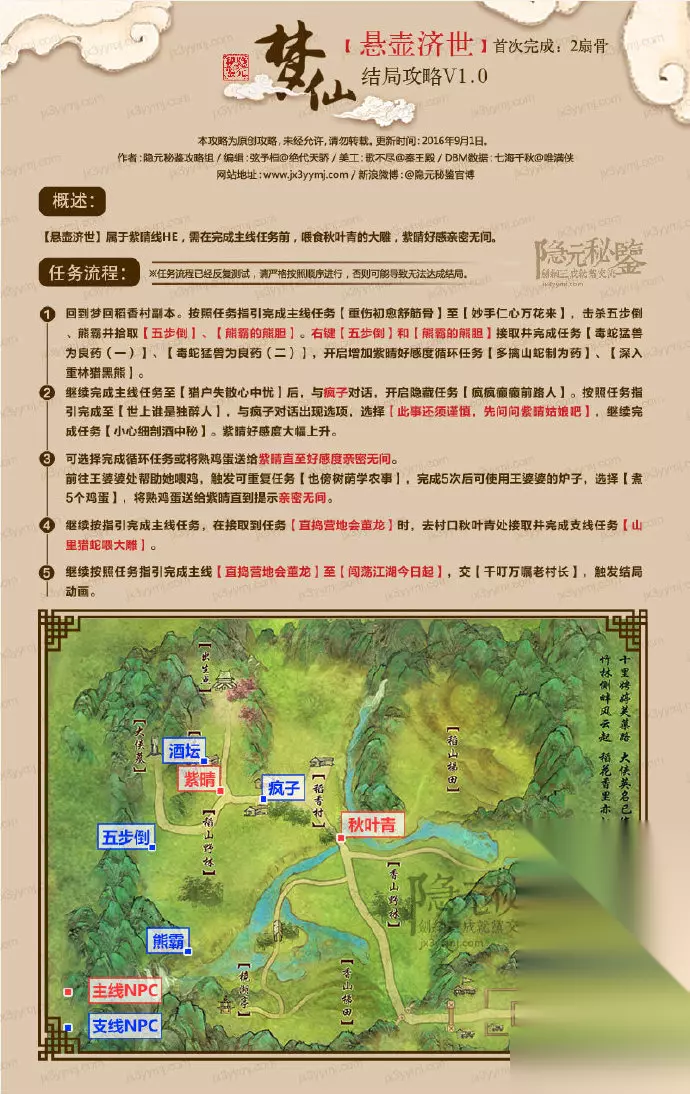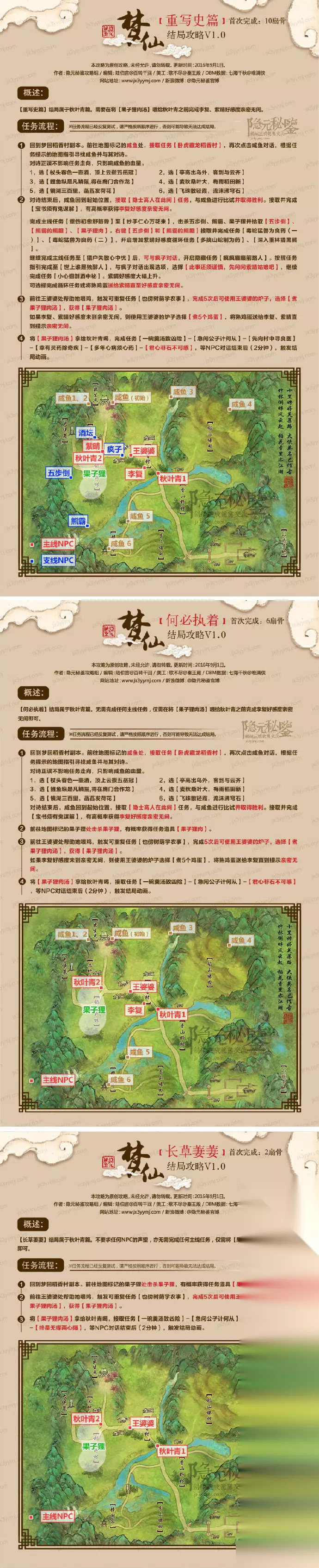 3、俪影侠踪 需要刷满小月的好感度。 小月的好感度比较容易刷,打下洋娃娃送给她,到处可以捉到兔子,捡到小乌龟送给她,随后随便送几个熟鸡蛋就可以刷满了。 随后触发任务,我们顺着做就可以了,这里织女给小月做衣服的道具可以在岸边采集,捉小乌龟的时候顺便就能捡满了。 给小月送完饭,我们不再理会后续任务,直接完成主线出村即可。 六、秋叶青篇 1、重写史篇 需要我们刷满李复和紫晴的好感度。 ① 李复的好感度可以通过接受咸鱼的挑战,击败咸鱼获得,咸鱼就在我们的出生点附近的亭子中。随后送礼熟鸡蛋即可。 ② 紫晴的好感度,可以通过击败五步倒、熊霸捡到道具使用接受任务找紫晴交任务获得,也可以通过接取疯子任务找到陈酒然后不给他,触发找紫晴的任务获得,紫晴本身的两个任务不建议刷,太慢了。随后送礼熟鸡蛋即可。 我们帮助王婆婆喂鸡,获得小炉子的使用权,击杀果子狸炖汤,秋叶青闻着味觉得像自己大厨水平,嘴馋吃果子狸病的厉害(不要食用野生动物!),我们跟着完成后续任务即可。