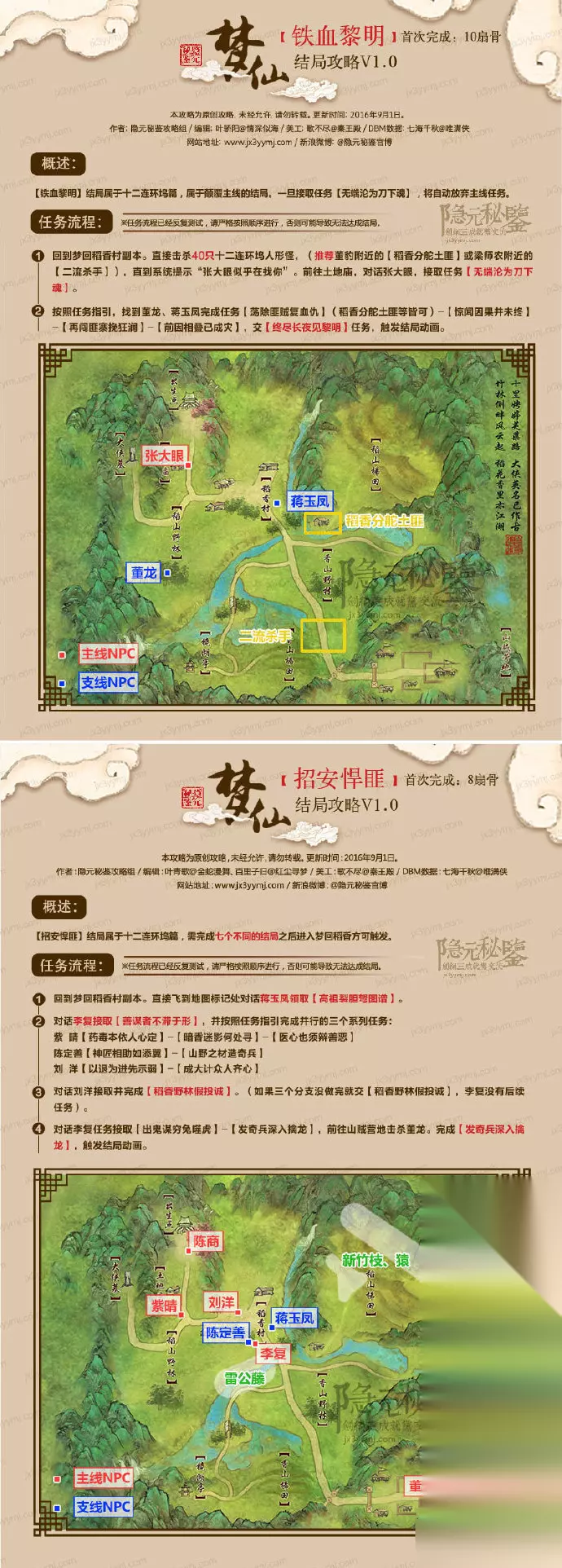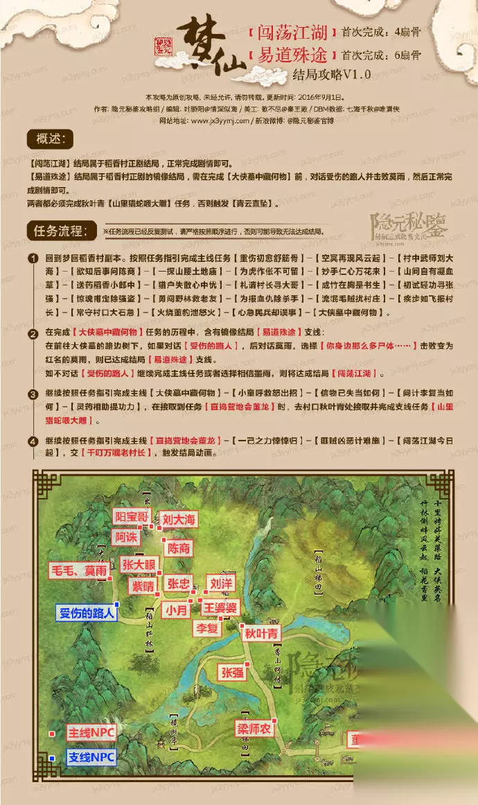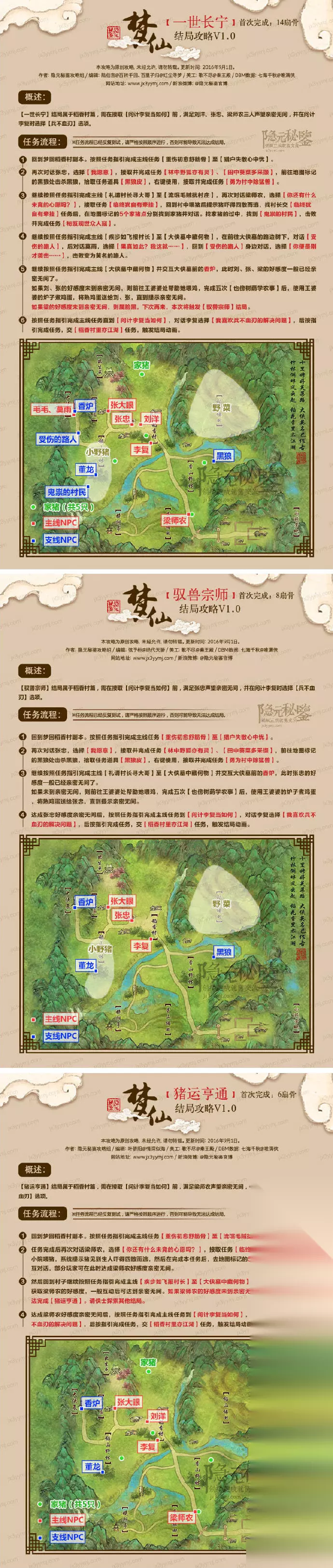 2、易道殊途 按部就班,就如一开始我们从零闯荡江湖那样把任务一个接一个做下去,什么好感都不刷。 做到村长刘洋让你去大侠墓取包裹,路上遇到NPC受伤的路人喊住了你,对话后,找到莫雨,选择不相信他。 随后莫雨发狂,将其轻松击败后继续任务。 做到最后王大石要你去会一会董龙任务(直捣黄龙会董龙),不要过去,找秋叶青接取任务(山里猎蛇喂大雕),随后去打4条菜花蛇,捡起来找大雕交任务。 随后对话王大石,直接一个自动化轻功来到董龙面前,剧情战败后,大雕将我们安然送回稻香村。 交任务,随后获得“易道殊途”成就。 三、稻香村篇 1、猪运亨通 这里我们需要刷满梁师农的好感。 梁师农好感度,在主线剧情推进到回报村长时,与梁师农对话(头顶并无任务标志,直接对话),梁师农舍不下自己喂大的猪猪们,给了你猪食让你帮忙喂养,此时回到村中喂猪,家猪因胆小受到惊吓,四散抛开,我们需要逐一巡回。当我们找完所有的猪后,梁师农的好感度依然是达不到亲密无间的,我们还需到大侠墓祭拜。 请一定提前刷满两者好感度,随后按部就班做任务,在问计李复时,多出一个兵不血刃的选项,选它!随后我们制造假的空冥诀交予董龙。 刘洋见我们胆识、智慧均有过人之处,还关心热爱家畜,于是放心地将稻香村交到我们手中。获得“猪运亨通”成就。 2、御兽宗师 需要刷满张忠的好感。 张忠的好感度在张忠发布任务之后,找其再次对话触发,两个任务一个是打野猪肉喂狐狸,一个是挖野菜他自己要抄野猪肉吃。做完之后,我们还需要到香山野林,击败黑狼,使用黑狼皮获得任务,交给张忠。此外,在大侠墓祭拜也可以增长好感度。 请一定提前刷满两者好感度,随后按部就班做任务,在问计李复时,多出一个兵不血刃的选项,选它!随后我们制造假的箜篌冥诀交予董龙。 刘洋见我们胆识、智慧均有过人之处,还关心热爱野生动物,于是放心地将稻香村交到我们手中。获得“御兽宗师”成就。 3、一世长宁 需要同时刷满三巨头村长刘洋、梁师农和张忠的好感度。 ① 村长的好感度,可以在去往大侠墓的过程中与NPC受伤的路人对话,随后选择相信莫雨,随后击败受伤的路人即可获得大量好感度。随后不断送礼熟鸡蛋即可。 ② 梁师农好感度,在主线剧情推进到回报村长时,与梁*农对话(头顶并无任务标志,直接对话),梁*农舍不下自己喂大的猪猪们,给了你猪食让你帮忙喂养,此时回到村中喂猪,家猪因胆小受到惊吓,四散抛开,我们需要逐一巡回。当我们找完所有的猪后,梁师农的好感度依然是达不到亲密无间的,我们还需到大侠墓祭拜。 ③ 村长的好感度,可以在去往大侠墓的过程中与NPC受伤的路人对话,随后选择相信莫雨,随后击败受伤的路人即可获得大量好感度。随后不断送礼熟鸡蛋即可。 ④ 张忠的好感度在张忠发布任务之后,找其再次对话触发,两个任务一个是打野猪肉喂狐狸,一个是挖野菜他自己要抄野猪肉吃。做完之后,我们还需要到香山野林,击败黑狼,使用黑狼皮获得任务,交给张忠。 请一定提前刷满两者好感度,随后按部就班做任务,在问计李复时,多出一个兵不血刃的选项,选它!随后我们制造假的空冥诀交予董龙。 刘洋见我们胆识、智慧均有过人之处,不但关心热爱家畜,还对各种野生动物上心,于是放心地将稻香村交到我们手中。获得“一世长宁”成就。